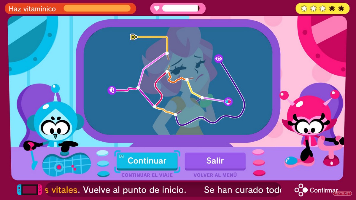Vitamin Connection presenta dos mecánicas bien diferenciadas en cada nivel. Por un lado, nos toca avanzar y explorar por el cuerpo de nuestro huésped humano en busca de las zonas infectadas (haciendo uso, para ello, de las distintas herramientas a nuestra disposición). Por otro lado, nos encontramos con determinados momentos, que coinciden con la llegada a los diferentes órganos afectados, en los que el curso normal de la aventura da paso a diferentes minijuegos que hacen que la diversión/inmersión estén garantizadas. Estas mecánicas, que van desde pruebas de baile hasta juegos de pelota, a pesar de dar de lado al componente explorador, dotan de variedad al conjunto y nos hacen poner nuestros reflejos y coordinación a prueba. ¡Por no hablar de las risas que generan! Estos juegos también se pueden jugar por separado desde el menú principal, lo que nos permite disfrutar de una diversión rápida, sin complicaciones. Si tenemos en cuenta que cada nivel puede durar en torno a 25-30 minutos, y que el sistema de guardado a medio camino puede llevar a borrar nuestro progreso por error, es una buena opción para unas partidas rápidas. Para finalizar, conviene recalcar que, con bastante frecuencia, nos encontramos con la obligación de regresar sobre nuestros pasos tras completar el minijuego final. Algo que, sinceramente, afecta negativamente al ritmo de juego.