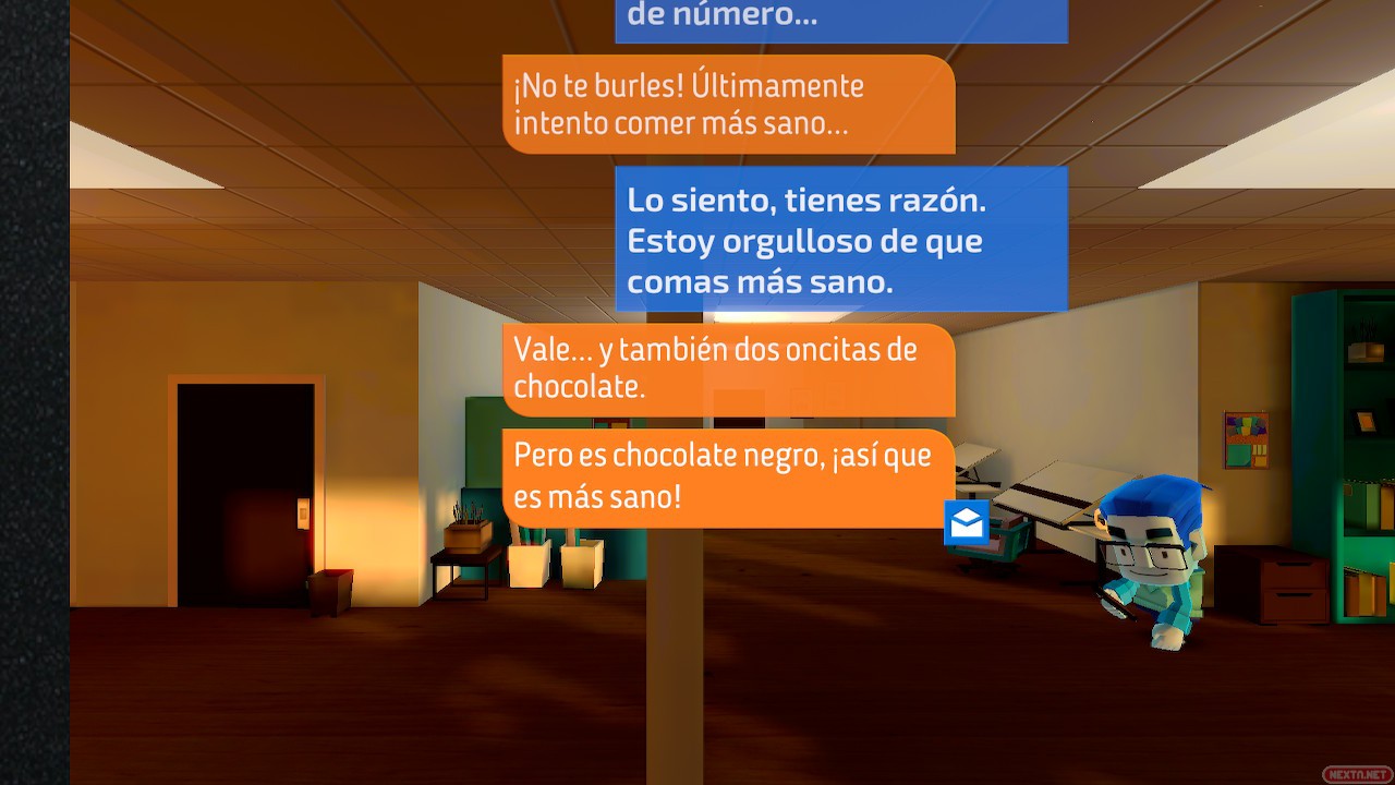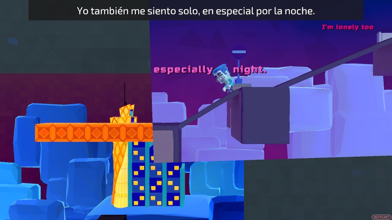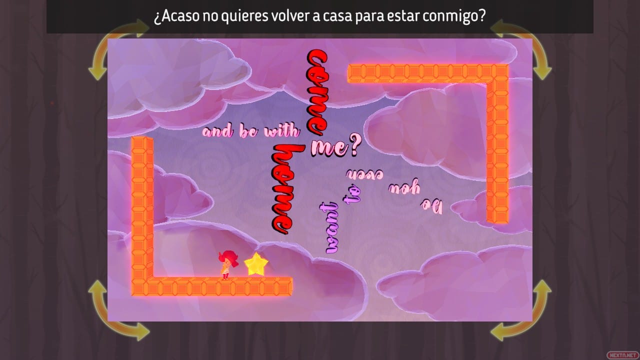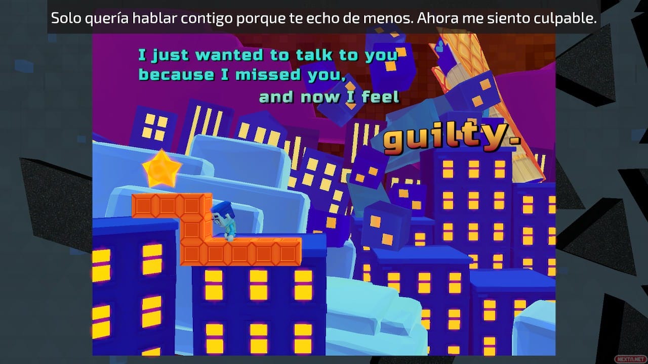 Sin embargo, como bien he dicho antes, el motor que nos hace progresar es la historia, por lo que los desarrolladores no quieren que nos quedemos atascados en un nivel y no podamos conocer el final. Para ello hay dos sistemas de pistas. El primero de ellos es muy evidente, vas al menú de pausa y pides que te den una pista. Este sistema no tiene ningún tipo de penalización, por lo que si únicamente queremos disfrutar de la historia podemos pedir una pista tras otra de esta forma hasta que el juego complete el puzle por nosotros. El segundo sistema es mucho más sutil, y nos sirve de constante guía indirecta para saber si vamos por la dirección correcta. Como durante los puzles los personajes siguen transmitiendo sus emociones, los letreros con dichas reflexiones van apareciendo conforme nos vamos acercando a la solución del puzle. Personalmente preferimos esta segunda opción, ya que está integrada perfectamente dentro de la jugabilidad y funciona como recompensa al jugador por trazar el camino correcto hacia la solución del puzle.