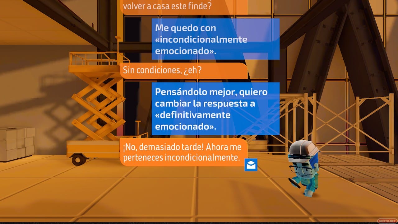 En cuanto a la historia en sí misma es muy conmovedora. Es un canto a la esperanza, que si bien no conseguirá sacaros una lagrimita, sí dejar una sensación muy reconfortante y agradable. Explora con mucho tino las inseguridades por las que puede pasar una pareja en una situación en la que no pueden verse por la distancia que hay entre ambos, todos los pensamientos que se puede llegar a tener en esos casos y cómo enfrentarlos. Por ello, nos ha parecido sensacional la forma en la que A Fold Apart combina narrativa con jugabilidad. Vamos conociendo la historia en base a los mensajes que se van enviando ambos miembros de la pareja, pudiendo, de vez en cuando, elegir algunas de las respuestas que podemos dar, entre dos disponibles en cada caso. Mientras vamos contestando estos mensajes, podemos movernos por el escenario, y en base a los comentarios que puedan hacernos dudar sobre algún aspecto de nuestra relación, empezamos los tramos donde está la verdadera chicha de la jugabilidad: sus puzles.
