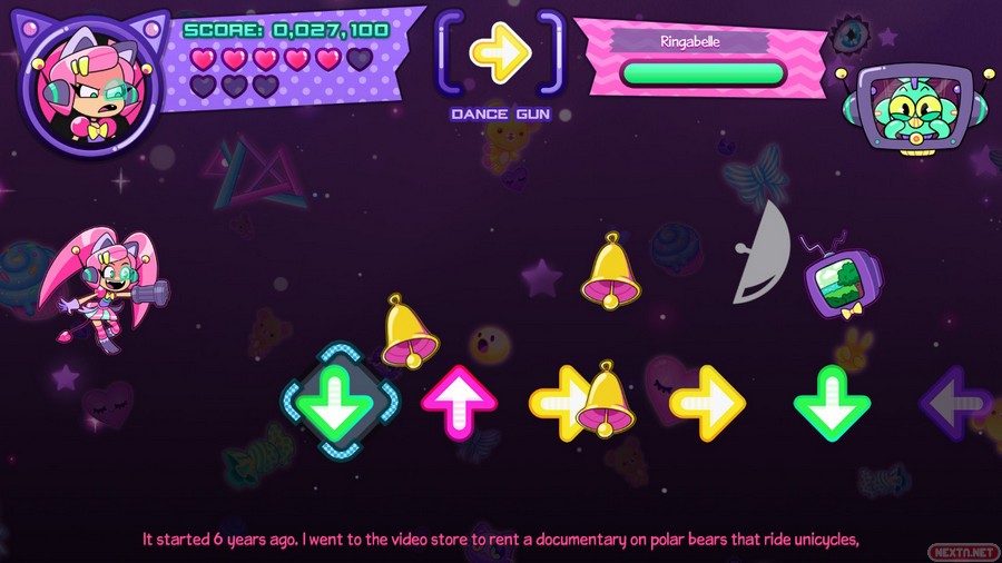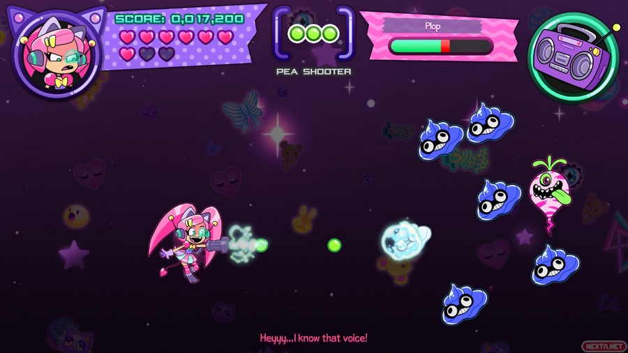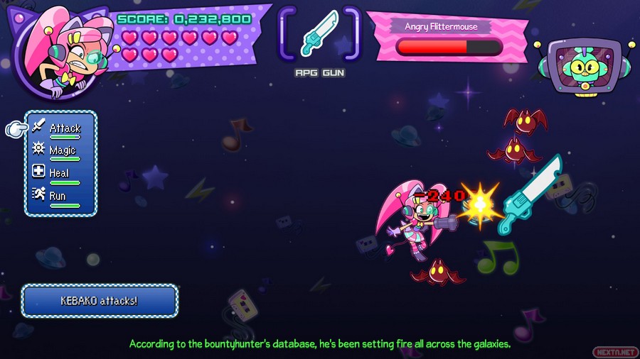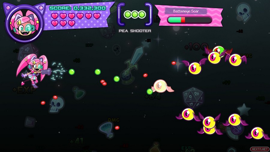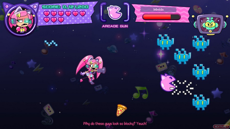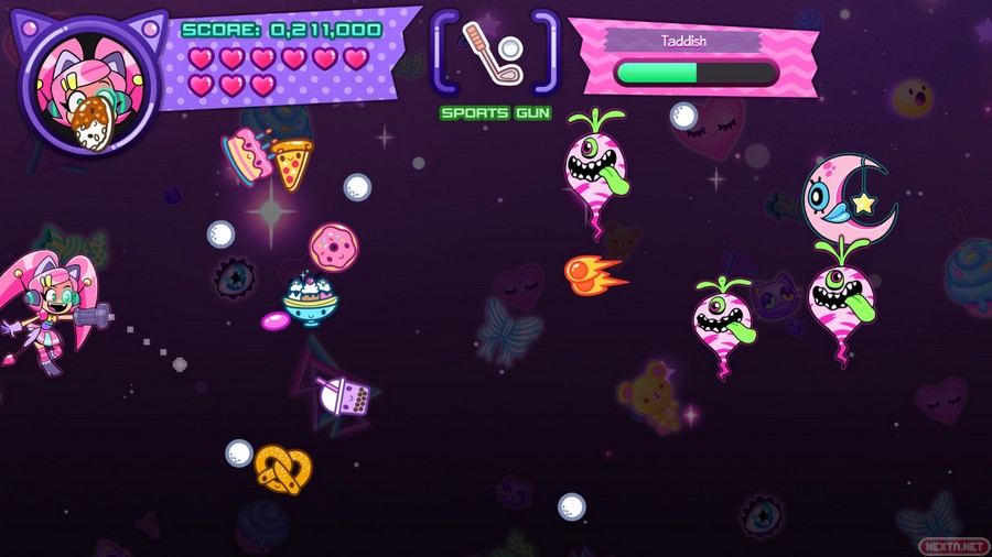 Obviamente, nuestra cazarrecompensas kawaii con orejas de gato, va a estar armada para poder defenderse de los enemigos. Y aquí, en las armas, es donde entra el punto fuerte de Cat Without Salad: Amuse Bouche, ya que estas armas están inspiradas en diferentes géneros de videojuegos como plataformas, RPG, deportivo, musical, etc. Según avanzamos en la pantalla, salen cartuchos (haciendo un guiño a los videojuegos) siendo el arma especial. Por ejemplo, si te toca el arma de plataformas, aparece un muñeco que nos recuerda al famoso icono de Nintendo, que puede saltar de un enemigo a otro para así derrotarlos. Si por otro lado te toca el arma de RPG, tienes una espada con la cual puedes hacer varios movimientos (atacar, curar, esquivar o ir más rápido, dependiendo de la opción que escojas). La verdad que es una manera muy curiosa de mezclar varios géneros de videojuegos, y ese guiño nos ha encantado. Estas armas, obviamente van a hacer mucho más daño a los enemigos que el arma base (unas bolas que se lanzan en horizontal, las cuales infligen poco daño). Eso sí, hay que ser la mar de habilidoso, porque con solamente un toque que recibamos, nuestra arma especial desaparece.