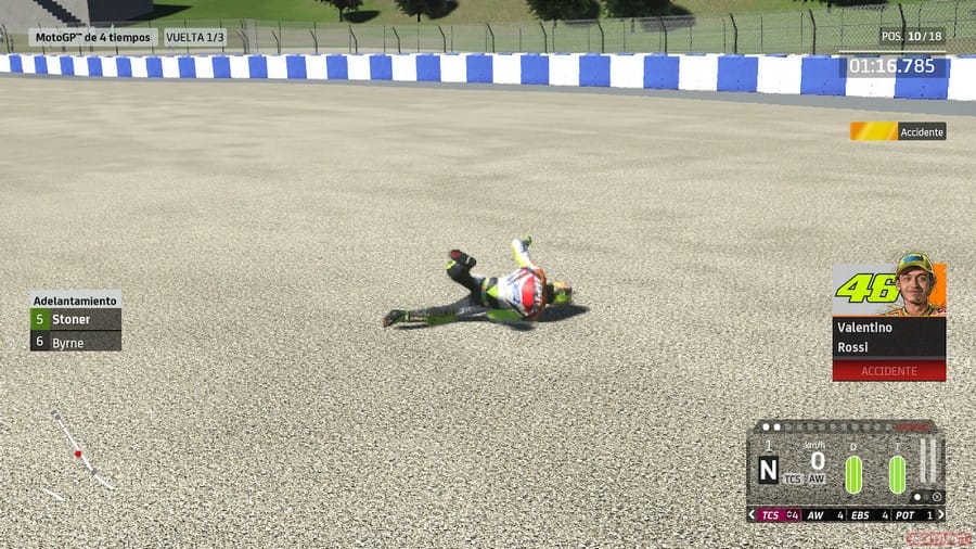 Las trazadas de las curvas, la sensibilidad y la conducción también mejoran respecto a sus antecesores, y dan un paso al frente en la carrera por hacer de esta simulación la más cercana a la experiencia de una competición real. Sin embargo, hay algo que choca de frente con este objetivo, y es que gráficamente sigue siendo muy pobre. Y decimos «muy pobre» por querer ser respetuosos. Al ser un juego en el que lo que importa es la conducción, podemos entender cierta dejadez en aspectos «secundarios» como es el caso de los espectadores o NPCs de los equipos. El problema es que hasta los modelos de los pilotos nos hacen pensar en una generación anterior a la actual, con las marcas, diseños de las motos y los trajes de carrera borrosos, casi imperceptibles.