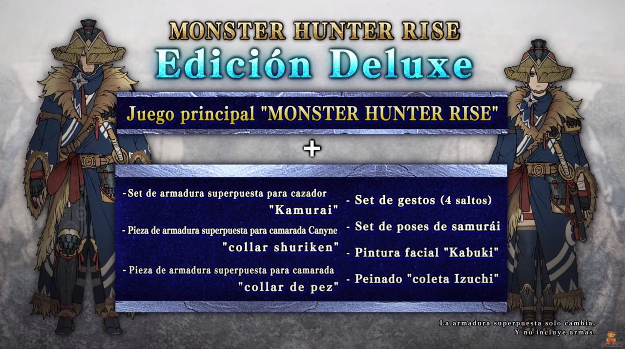 Y ahora viene cuando «la matan», porque sí, hemos conseguido igualdad para los mercados en cuanto a poder disfrutar de Monster Hunter Rise en todas partes a la vez, pero a la hora de comparar ediciones especiales… Bueno, tenemos una prevista para América y Europa que, además del «Deluxe Kit DLC pack», viene con una figura amiibo de Magnamalo, el monstruo insignia de este capítulo., un set de pegatinas y un pin «Marca Kamura», la aldea principal de este título.
