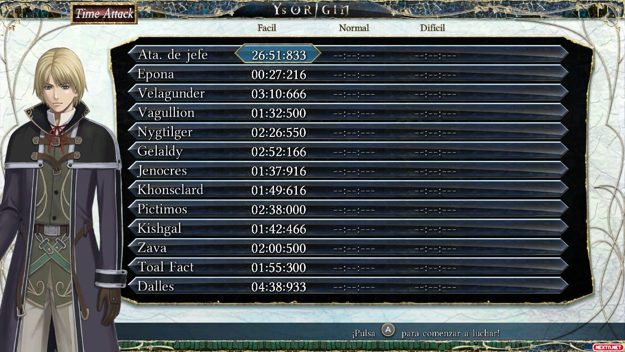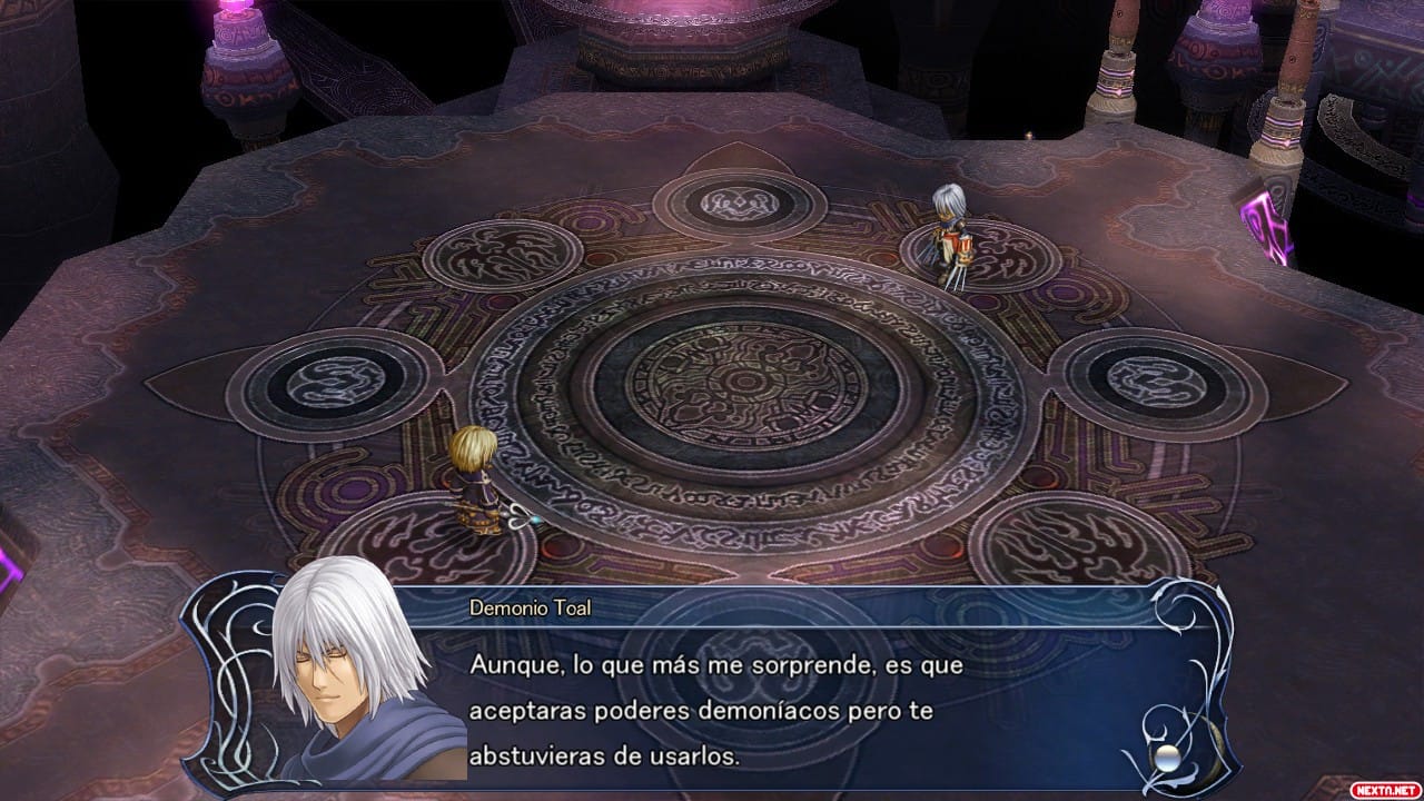 Por último, solo queda mencionar que, a diferencia de lo que ocurre con muchos de los RPG actuales, Ys Origins está completamente en castellano, así que esta no es una excusa para no jugarlo. No obstante, es cierto que, en el menú, en el que pasamos unas cuantas horas seleccionando objetos, se han mantenido términos en inglés, pero al ser bastante visual, esto no supone ningún problema para aquellos que no conozcan ni una sola palabra de la lengua inglesa. Además, también existe algún que otro error cosmético, sobre todo signos de apertura de exclamación y de interrogación colocados al final de una línea, quedando las oraciones exclamativas e interrogativas en la siguiente línea.