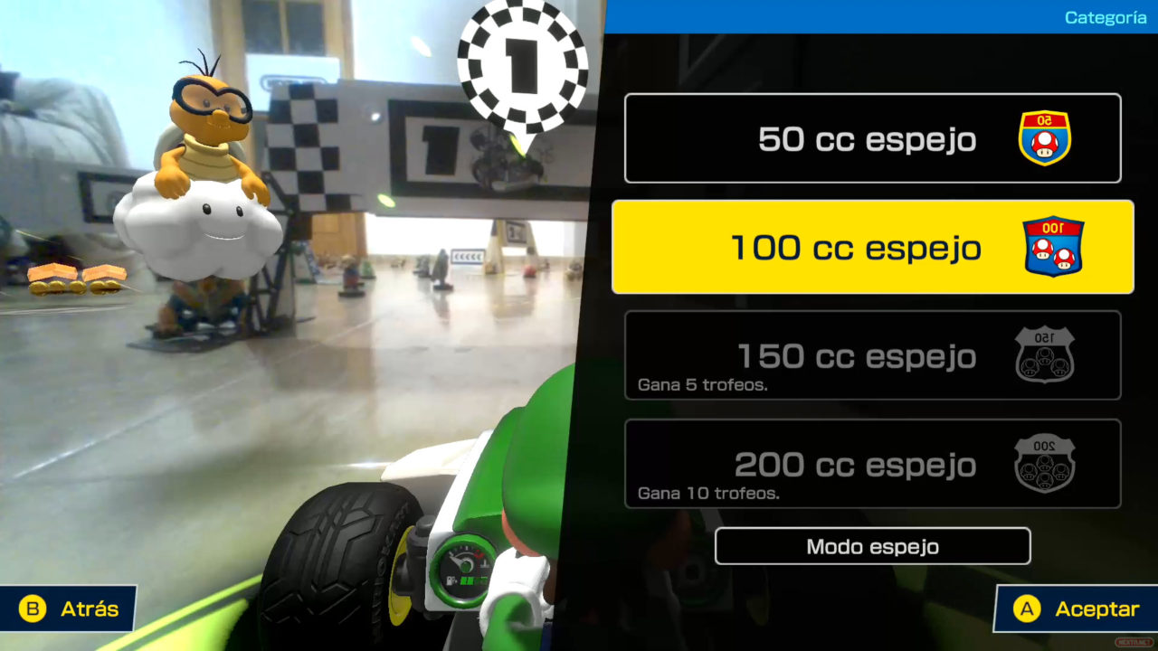 Hablamos de Nintendo, por lo que la parte «videojuego» difícilmente estaría descuidada. De hecho, tenemos un Mario Kart con su habitual variedad de nueve copas, champiñón, flor, caparazón, estrella, plátano, hoja, rayo, corona, más una especial en la que podremos crear nuestras propias condiciones de pista. Y ahí es donde tenemos una de las variantes con los clásicos, y es que el trazado puede ser el mismo todo el rato, y lo que va cambiando son las particularidades de cada uno de los 24 circuitos, habiéndolos submarinos, helados, desérticos con tormenta de arena incluida, etc. Los elementos particulares del circuito serán los que hagan que cada pista sea diferente. Luego, tenemos cuatro cilindradas, las ya clásicas 50cc, 100cc, 150cc y 200cc, y ciertamente nuestro kart en la vida real se desplazará más rápido dependiendo de la que seleccionemos. 50cc es muy sencillo, mientras que en 200cc el verdadero problema es que nuestro salón (o donde estés jugando) se nos quede pequeño. Es decir, el coche va más rápido, por lo que cuesta más de controlar, así que tienes que hacer pistas con menos curvas, o estarás chocando constantemente con muebles. Tampoco es que puedas hacerla mucho más grande, dado que la cobertura es limitada.