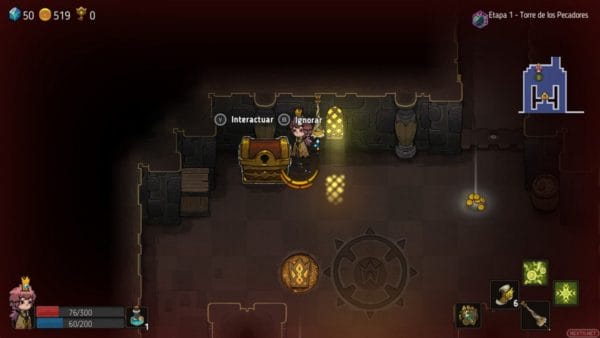 Hay que tener en cuenta que, a pesar de todas las posibilidades que tenemos, podemos morir, de hecho, lo raro sería no hacerlo, ¿qué pasa entonces? Al principio del análisis ya comentamos que, uno de los obstáculos que se encuentra un estudio a la hora de desarrollar un rogue-lite es cómo hacer que el jugador, a pesar de tener que empezar de cero cuando muere, sienta que no ha perdido su progresión o, al menos, parte de ella. Crown Trick resuelve esta faceta de una forma que otros han usado ya, me vienen a la cabeza ejemplos como Rogue Legacy o Enter The Gungeon, donde antes de cada partida tenemos la oportunidad de visitar un nexo en el que mejorar a nuestro personaje. Este título funciona de forma similar, haciendo uso de una moneda especial que vamos recogiendo a medida que avanzamos por las mazmorras, pudiendo comprar mejoras permanentes para Elle. Eso sí, para ello hemos de encontrar antes a sus habitantes en los distintos niveles y liberarlos, para que puedan ir a este lugar. Podemos adquirir mejoras directas de daño, de nuestra poción de curación o aumentar la capacidad de encontrar objetos raros, entre otras. Hay muchas ramas en las que profundizar y que harán que, cada vez que nos adentramos en la pesadilla, lo hagamos siendo más fuertes.