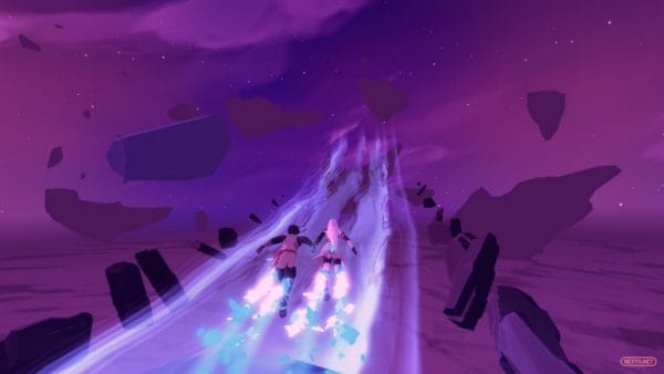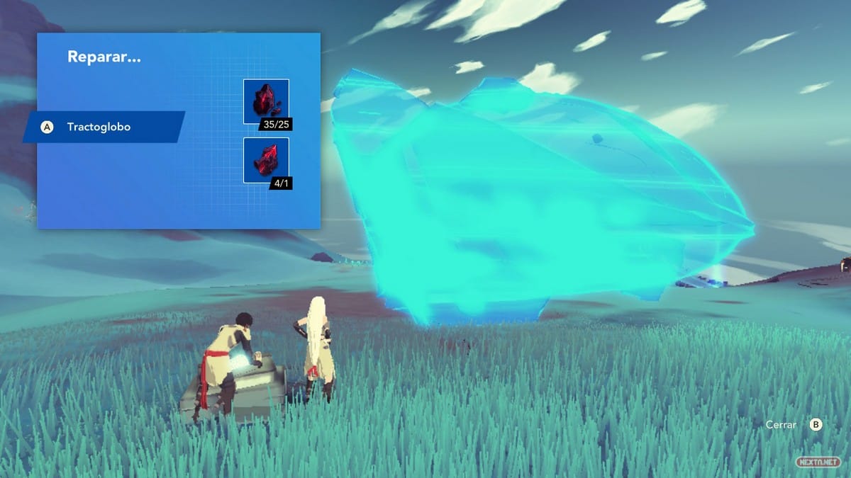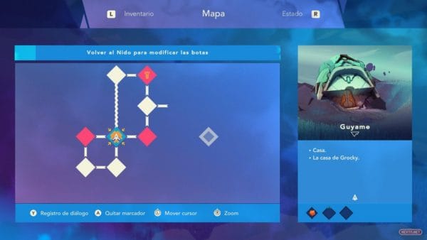 Y es que Inma tiene toda la razón. Contamos con zona de aseo (para curarnos y ducharnos), cocina para elaborar alimentos (al más puro estilo caldero de Breath of the Wild), sala de estar para sentarnos a charlar, dormitorio para descansar y lo que se tercie y algunas otras actividades que, al no venir de serie, tampoco vamos a destriparos. A pesar de las comodidades del «hogar», tras quedarnos sin energía eléctrica nos vemos obligados a salir en busca de flujo. Una suerte de corrientes de energía que debemos seguir mientras nos deslizamos por un extraño planeta hecho pedazos y compuesto por diversos islotes flotantes. Tras recolectar los materiales la noche da paso a una relajada charla en la que en función de nuestras respuestas vamos, o no, ganando diferentes atributos.