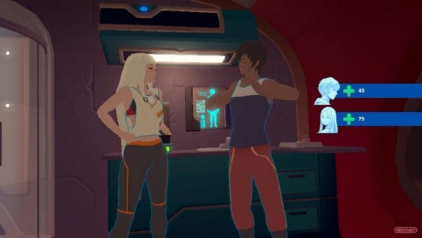 Muchos os preguntaréis, con semejante coctel de mecánicas… ¿cómo funciona su cooperativo? La verdad es que, mucho mejor de lo esperado. El sistema de cooperación nos lleva a fomentar el trabajo conjunto en casi todas sus vertientes jugables. En el exterior, cualquiera puede tomar la responsabilidad de deslizarse por los pastos planetarios mientras el otro «caza» alimentos. Y si en el exterior un jugador se encarga de deslizarse y el otro de recolectar recursos, las batallas nos obligan a sincronizarnos y combinar ataque y defensa para salir airosos. ¿La cocina?, a nuestra elección queda (a nosotros la elaboración de turnos nos facilita mucho el trabajo) decidir quien va a ser el encargado de preparar la comida en cada momento. Por otro lado, a vueltas con la fuerza de su narrativa, decidimos que cada uno tomara las decisiones correspondientes a su respectivos alter egos jugables, ¡como en la vida misma!