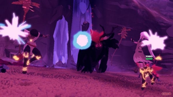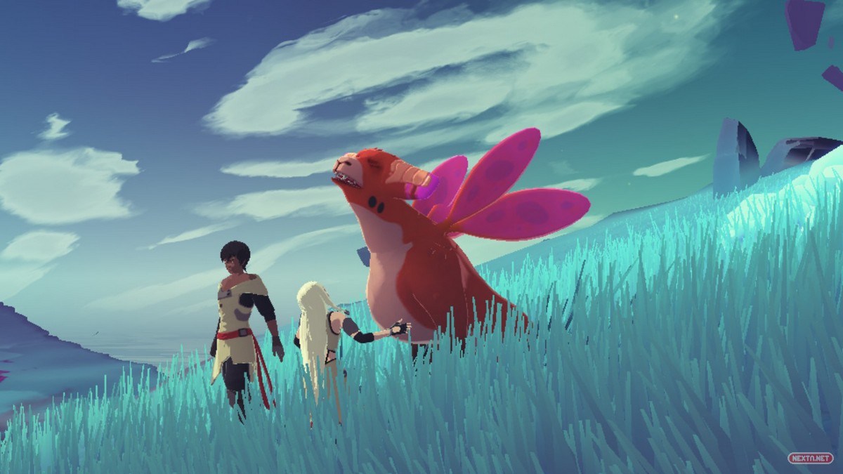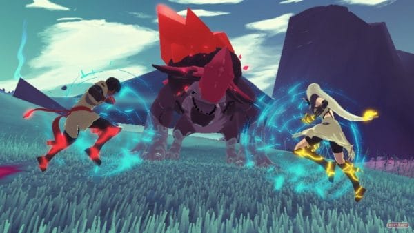 Y hablando de combate… Es cierto que, más allá de las secciones narrativas de las que hablaremos más adelante, nuestra tarea principal pasa por explorar y recolectar recursos mientras disfrutamos de un entorno (visual y sonoro) realmente espectacular. No obstante, no faltan aquí las batallas contra temibles monstruos. Y en ellas, una vez más, el trabajo en equipo resulta fundamental. Enfrentamientos que, pese a no ser demasiado profundos, complejos ni variados (el surtido de especímenes a los que enfrentarnos es bastante limitado) y encontrarse a medio camino entre las batallas en tiempo real y los combates por turnos, resultan entretenidos. Conseguir que ambos personajes logren sincronizarse para lanzar un ataque en equipo, combinar formaciones defensivas y ofensivas, socorrer a nuestro compañero caído o simplemente liberar a la fauna local corrompida (que posteriormente podemos tener como mascotas) son elementos ya de por si satisfactorios por separado.