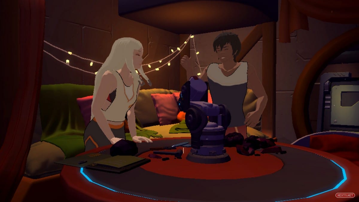 Dos amantes que lo dejan todo atrás, escapando de una sociedad donde su relación no tiene cabida, para hacer posible su historia de amor. A primera vista, puede parecer un simple cliché narrativo, una escusa para que Haven nos presente su hilo argumental o un mero cascarón cosmético para sus distintas mecánicas. Nada más lejos de la realidad. Comenzamos la aventura en nuestro nido (nunca mejor dicho)… de amor. Dicho cubículo ejerce las veces de centro neurálgico y no es otra cosa que la nave en la que nuestros protagonistas aterrizaron manualmente, tras desactivar todos los sistemas de seguimiento.