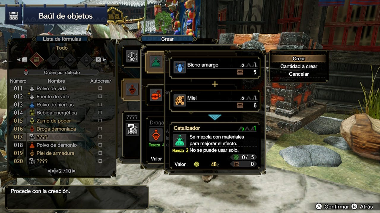 La lista de fórmulas es un clásico de Monster Hunter, un listado de todo lo que se puede crear combinando los objetos disponibles. En Monster Hunter Rise, además de haberse simplificado las cosas, también hay un par de funciones inteligentes que nos pueden ahorrar tiempo. Espera, ¿cómo se han simplificado? Pues imagina: para crear algunos objetos no necesitas dos ingredientes, sino uno. Es el caso de las pociones, para las que antiguamente necesitabas una hierba y una seta azul, mientras que ahora solo necesitas el primer ingrediente, tal y como ocurre con los antídotos (solo necesita una hierba antídoto) o el desodorante (se hace con una hierba solvejada).