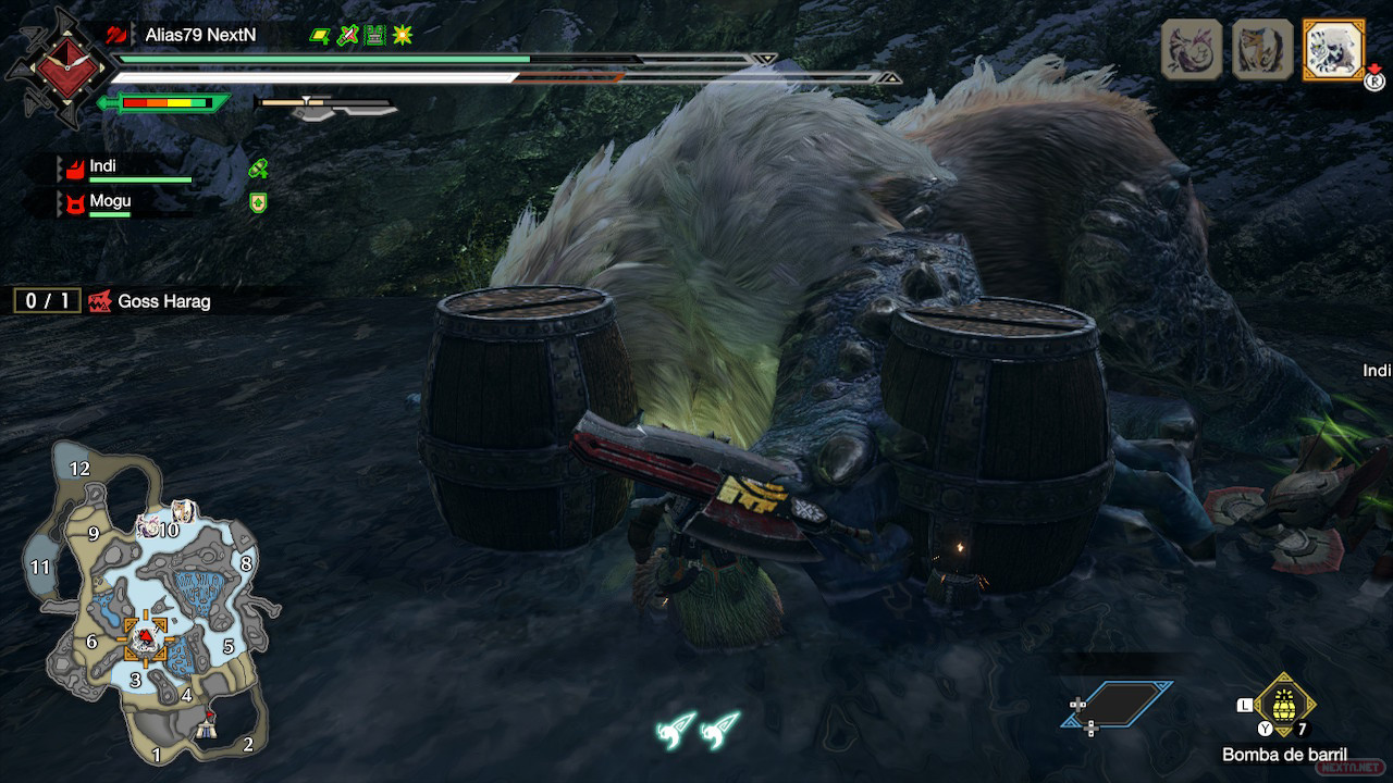 Bueno, ahora sabes cómo crearlas, pero… ¿cómo se usan? Esto es más sencillo aún. Digamos que hay varias tácticas. Lo primero que debes saber es que las bombas barril no hacen mucho daño, son más bien como un temporizador (o mecha) para hacer estallar las bombas grandes y las megabomba barril, dado que no explotan por sí solas, ¡a no ser que las golpees! Había quién en el pasado, en anteriores Monster Hunter, las reventaban de una patada (¡levanto la mano!, temerario, ¡pero divertido!), pero resulta que en Monster Hunter Rise la acción de patada simplemente no existe, suponemos que para evitar las patadas entre usuarios, pues a veces suponían un gesto feo. Por suerte, ahora los kunai son infinitos, y si consigues apuntar bien desde lejos son ideales para reventar estos explosivos sin llevarte a ti por delante, pues otra opción es golpearlos con tu arma.
