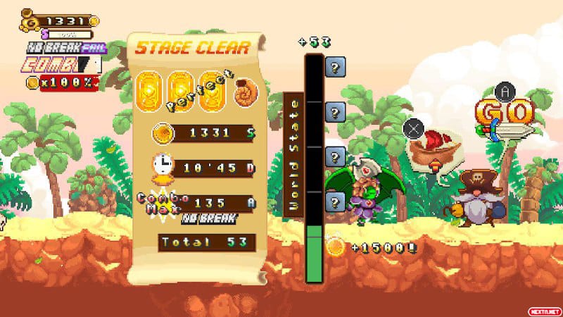 Directamente empezamos pudiendo elegir a uno de los cuatro personajes, que podemos cambiar cada vez que empecemos una nueva pantalla (a menos que continuemos de una a otra sin pasar por el menú). Más allá del aspecto visual y su elección de arma, las diferencias entre unos y otros son testimoniales, por lo que elegid el cazarrecompensas que más os guste. Un primer nivel nos hace de tutorial gracias a los consejos de un peculiar pirata que nos echa un cable para enfrentarnos a nuestro primer boss y a partir de ahí nos topamos con el mapa de nuestra aventura: cuatro islas diferenciadas (solo desbloqueada la primera), con unos cuantos niveles cada una. Una veintena de fases que se antojan pocas si las comparamos con otros títulos plataformeros, pero que esconden un reto suficientemente importante en lo que a dificultad respecta.