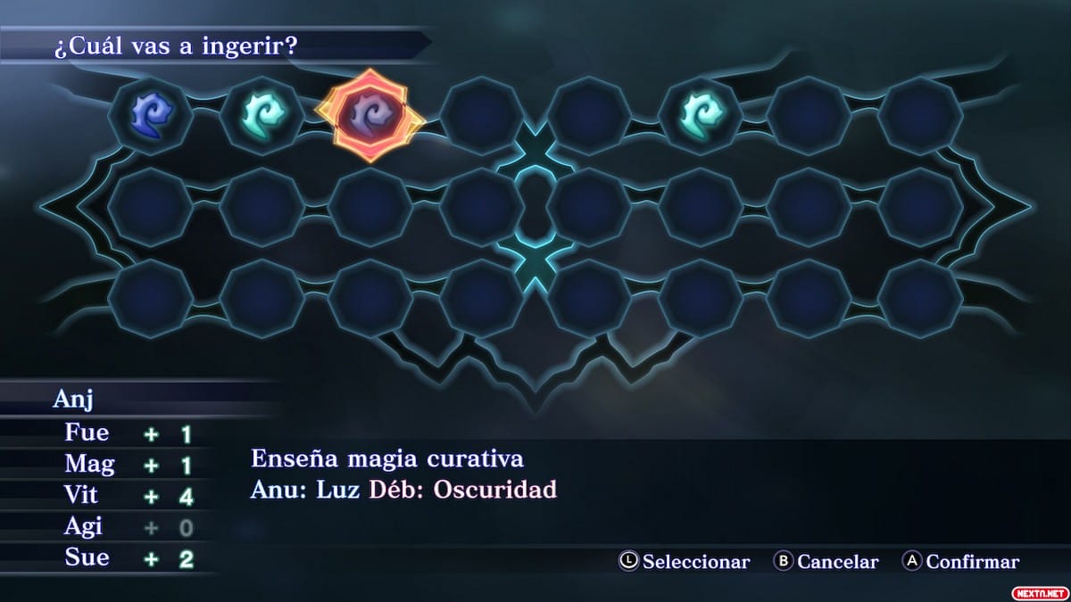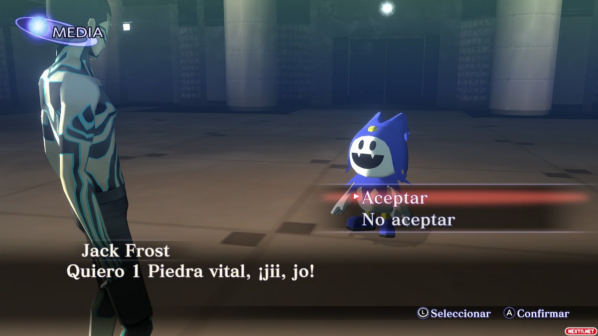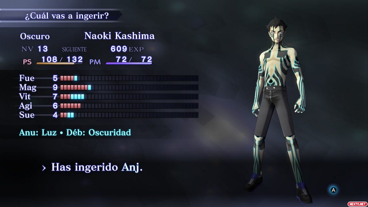 Además, debemos adaptarnos a este sistema de castigos y recompensas usando los diferentes “magatama” que se desbloquean en lugares de lo más dispares. Estos objetos son los únicos equipables que se han incluido, puesto que en las tiendas no podemos comprar ni armas ni equipamiento de defensa, lo que hace que sea necesario tener en cuenta en todo momento las diferentes debilidades, tanto de los enemigos como de nuestro protagonista. Así, los magatama nos permiten alterar las estadísticas del Semioscuro, pero también cambiar precisamente estas debilidades, y es que necesitamos hacer uso del más adecuado en el momento oportuno (Matador os saluda desde la barrera, con su sonrisa picarona).