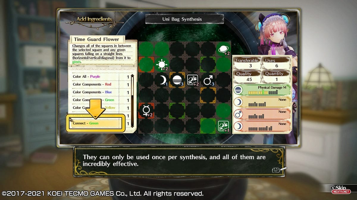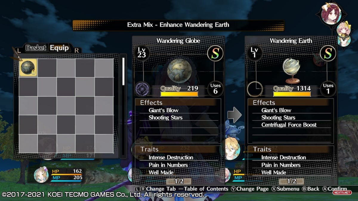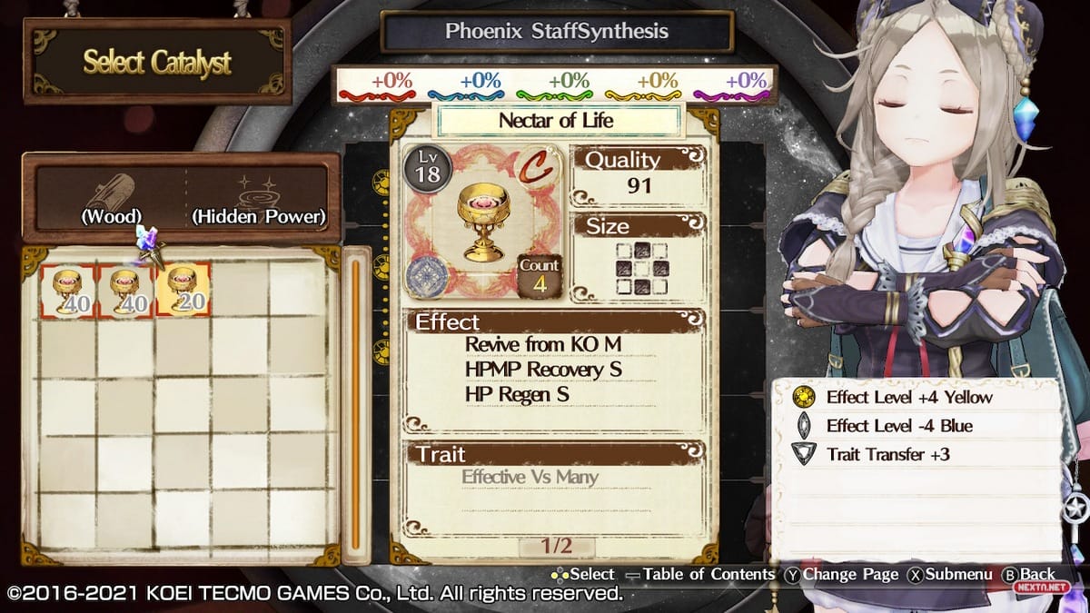 En el caso de Atelier Firis DX, los calderos ceden su plaza a los catalizadores, una serie de ingredientes que además de poder usarse como tales, pueden afectar desde fuera a los tableros que salen al paso. En otras palabras, son como calderos mermados de usar y tirar — en breves explicamos por qué están mermados —. Otras cosas que desaparen son las casillas que refuerzan un color específico y las esferas de las que hablamos en el párrafo anterior. Los catalizadores fijan una serie de «joyas encadenadas» en los tableros y si dichas cadenas son completamente pisadas por piezas, otorgan cosas adicionales al objeto a crear (dan «traits», aumentan el número de artículos que salen de un sintetizado, etcétera). Es importante mencionar que a veces las piezas deben ser de un color específico para que la cadena se active. A pesar de que mejoraron la interfaz, haciendo más fácil identificar cómo llevas las concentraciones elementales de cara a sacar «X» o «Y» efecto para un objeto, tomaron una decisión que hizo que su sistema de alquimia nos parezca uno de los más tediosos de la franquicia: en vez de darle más relevancia al nivel del alquimista de Firis, meten niveles a la hora de crear literalmente cada objeto. Es decir, para crear un ítem optimizado debes sintetizarlo múltiples veces, lo que es un desperdicio enorme. ¿Quieres equiparle tres «traits» a tu bomba sin depender en demasía de un abanico pequeño de catalizadores o buscas simplemente más libertad al mover tus piezas? Pues por increíble que suene, te toca «farmear» el objeto como si esto fuera un «gacha». Eso sí, al menos ahora cuando superpones piezas, la anterior no desaparece (los colores pisados se cambian por el nuevo y los huecos vacíos obtienen también al recién incorporado).