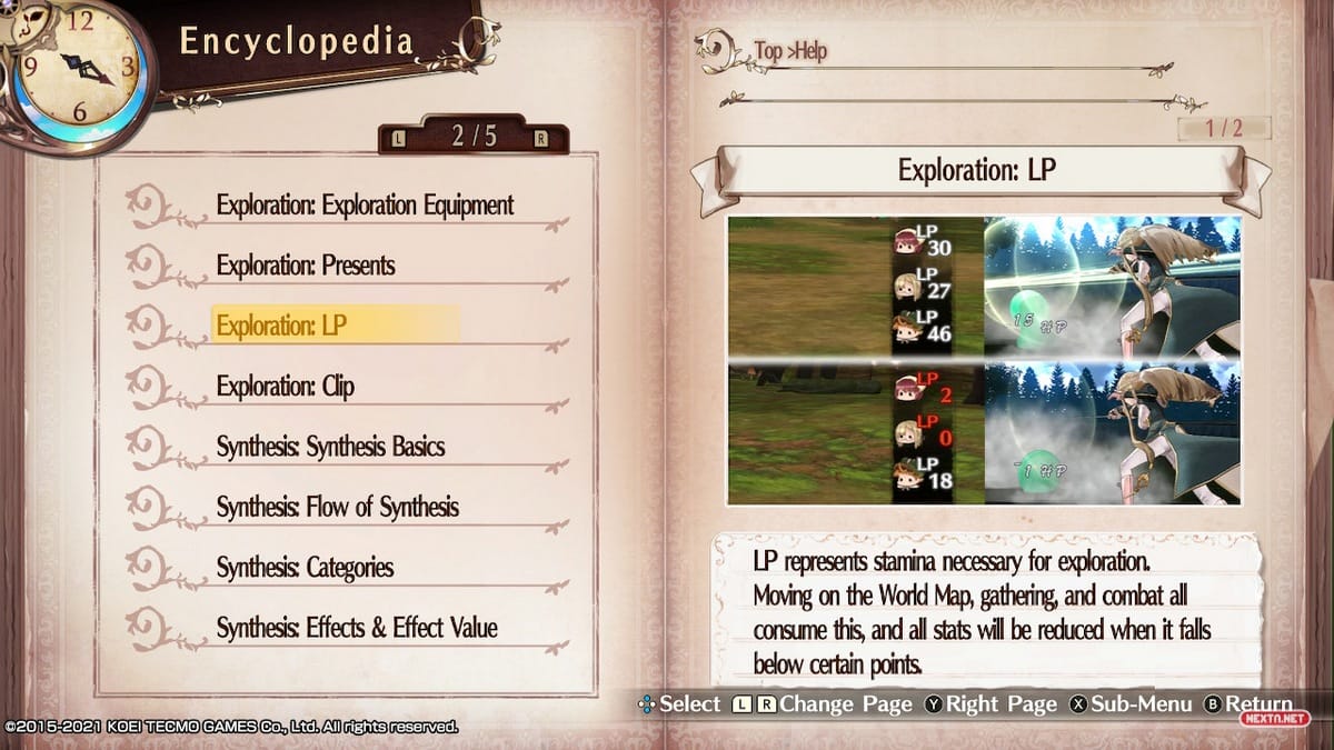 Ya sea para buscar pelea, para recolectar materiales o para llegar a nuevos lugares, explorar no es una opción, es una necesidad. En Atelier Sophie DX se opta por la clásica fórmula de la ciudad o pueblo que hace las veces de base de operaciones y un «World Map» con el que decides a dónde ir. Como viene siendo habitual en estos proyectos de Gust, los ingredientes se obtienen mediante puntos de recolección que destacan en el escenario con auras brillantes. Algo curioso que hicieron solo en este componente de la trilogía es la implementación del «Gathering level»: explorar mucho un lugar permite encontrar mejores recursos, pero también vuelve a los monstruos de la zona más poderosos. A continuación vamos a bucear en otros factores a tener en cuenta: el ciclo día y noche, junto a los cambios en el clima, afectan a los materiales y a los monstruos que se encuentran en la naturaleza. Del mismo modo, el día de la semana influye en las peticiones de los ciudadanos, en la disponibilidad de ciertos eventos y en la mecánica de los rumores que aquí está presente (si compras un rumor desbloqueas temporalmente desde materiales valiosos en alguna zona hasta peleas contra jefes). La alquimia da juego, por lo que no es raro pensar en que un alquimista pueda tratar de facilitarse sus exploraciones, haciéndose por ejemplo una mochila para poder cargar con más cosas o unos zapatos mejores para caminar deprisa, a estos se le conoces como «Exploration Equipment» y Sophie solo puede llevar cinco encima. La desarrolladora decidió poner a los «LP» como broche en este apartado. Cada personaje tiene un valor numérico que sirve básicamente para medir su cansancio. Estos pueden recuperar fuerzas con la ayuda de comida, pero si te descuidas los «stats» caen en picado, haciendo que la relevancia en combate de más de uno se vuelva casi nula.