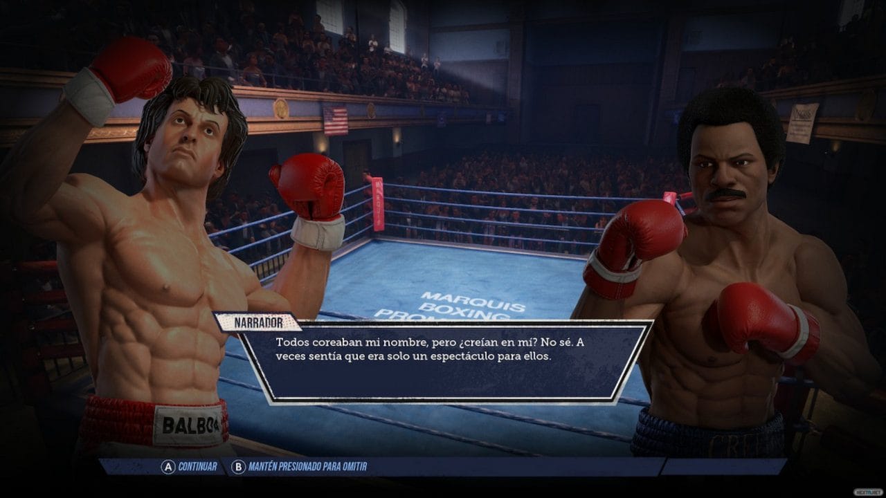 Big Rumble Boxing: Creed Champions propone la apetecible experiencia de jugar con los boxeadores de todas las películas de Rocky (6 pelis) y Creed (2 pelis de momento), presentando para cada uno de ellos una historia original, con escenas nunca vistas en las películas e incluso con encuentros y reencuentros muy improbables, como Ivan Drago y Clubber Lang, los «villanos» de Rocky 3 y 4, o revanchas amistosas entre Donnie Creed y Ricky Conlan. Para todos los fans de la saga cinematográfica, es una idea atractiva, sin duda, pero los bajísimos valores de producción del juego, junto a unos diálogos vulgares e infantiles en el modo arcade, hace que sea difícil convencerte de estar viendo realmente a los personajes de las películas, y no un fanfiction pobre.