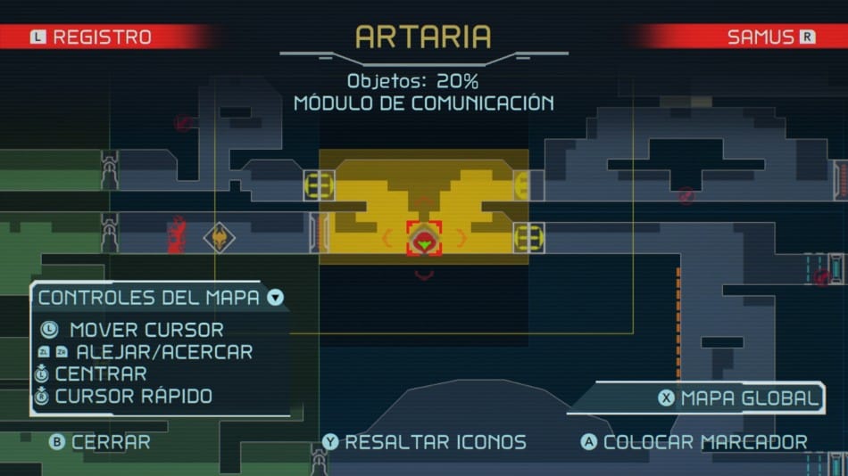 Eso sí, el mapa de Metroid Dread es uno de los más completos que hemos visto en un juego de este estilo, aún más evolucionado que en Samus Returns. Ya no se compone por celdas, sino que muestra una representación más detallada de cada habitación, usando un código de colores para mostrar condiciones específicas (por ejemplo, temperatura extrema o zonas con robots E.M.M.I.), destacando en «negrita» todos los espacios en los que ya hemos estado físicamente dentro de cada habitación (si os da TOC eso de tener puntitos del mapa sin explorar, lo vais a pasar francamente mal), destacando zonas de guardado y otros puntos de interés, los tipos de puertas y si las hemos abierto o no, e incluso la ubicación de los coleccionables que ya hayamos encontrado (lo que nos ayudará a conseguir el 100% más fácil). También podemos colocar marcadores para recordarnos zonas a las que debemos volver.