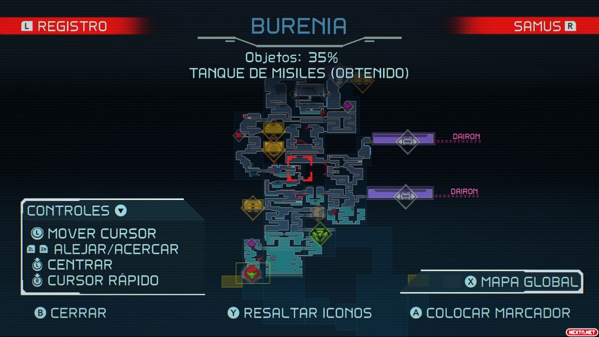 Suerte que tengo mi mapa. Nunca había tenido un mapa tan definido y detallado, que me mostrara la forma exacta de cada habitación que visito, que ilustrara tan bien las mejoras que me faltan, los lugares que no he alcanzado y las estatuas chozo que he encontrado y que me quedan por encontrar. Ahora, incluso puedo poner marcadores en el mapa para señalar lugares importantes para mí. Es un mapa intuitivo en el que tanto el color como la intensidad de los iconos me explican a la perfección todo lo que necesito saber, algo importantísimo en una aventurera como yo, sobre todo, teniendo en cuenta que esos E.M.M.I. tienen sus zonas muy bien delimitadas…