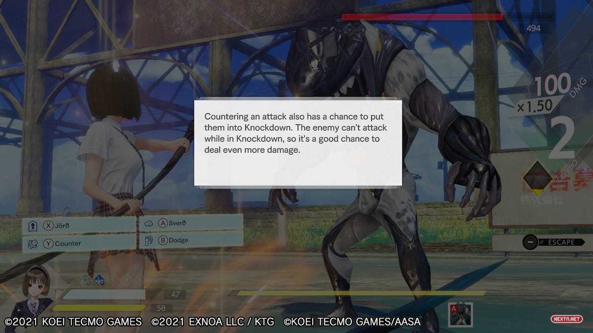 Otra cosa a comentar con respecto a los ataques encadenados, es que los enemigos al recibirlos pueden entrar en estado de “Knockdown”, quedándose indefensos temporalmente. Cuando eso está cerca de suceder, el perjudicado se ve rodeado por un indicador que se oscurece en base a la cercanía a ese estado. Sin embargo, Blue Reflection: Second Light prefiere no quedarse en meros «stuneos» y va un paso más allá. Algunos oponentes tienen la capacidad de levantar barreras tras entrar en «Knockdown». En ese momento, el equipo debe centrarse en atacar mucho para reventar las barreras y forzar un “One-on-one” entre un personaje y el adversario a batir. Este peculiar uno contra uno brinda 5 opciones frente a un rival: atacar, hacer una acción de autosoporte (subirte la defensa, por ejemplo), esquivar para evitar que te reduzcan el combo, hacer un «parry» en el que el timing es clave y la recompensa es no recibir daño, un posible «stuneo» del rival y mantener tu combo mientras que el contrario sufre una buena toñina y, por último, está el poderoso “finisher”, que depende de llenar un medidor para poder usarse. Sobra decir que todos estos “action commands” tienen que recargarse tras emplearlos, que tus aliados echan un cable de vez en cuando y que el número de combo que consigues acumular se transmite luego a la batalla normal. Por otro lado, durante un “One-on-one” haces más daño y es más fácil subir el contador de combos. Por si fuera poco, una barrera creada por la «Reflector» recibe los daños en lugar de los «HP». El «One-on-one» también puede ser iniciado por el otro bando y este termina con el agotamiento de la barra amarilla que emerge en la esquina de la pantalla, con la caída del rival o cuando tus puntos de salud bajan su valor numérico a 0 (no hay barrera si esto lo inicia el otro).
