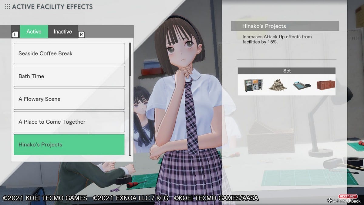 A continuación toca tener en cuenta a los sets: crear y colocar determinados conjuntos de construcciones en la escuela, da bonificaciones adicionales. Tiempo después del desbloqueo de los sets, también habilitan la posibilidad de mejorar los establecimientos. Gracias a esas mejoras, estos obtienen efectos nuevos o potencian los antiguos. Ya para cerrar este apartado, nos queda explicar que a partir del capítulo 2, el «crafteo» de objetos comunes gana algo de profundidad. Un resumen rápido es que al crear algo hay tres acompañantes y una líder. Dicha líder le brinda características a lo que hace. Por ejemplo, Ao es capaz de hacer una tortilla que además de curar salud en combate, suba el ataque a su consumidor. Por otro lado están las «units», que aportan su granito de arena dependiendo de la combinación que decidas formar para hacer «X». Siguiendo con lo de antes, pueden aumentar la cantidad de salud que restablece la tortilla.