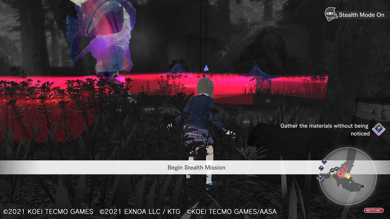 En otro orden de cosas, al explorar una de las ideas que más nos gusta de Blue Reflection: Second Light es el «modo sigilo». Cuando se encuentra activo, Ao camina en cuclillas, el escenario se torna gris y aparecen estelas rojas. Estas sirven para indicar el rango de visión de los enemigos que pueblan el escenario y también se reflejan en el mini mapa. La gracia es que, aparte de para evitar que te persigan, es útil al pelear. ¿Cómo? Golpear a un enemigo en el escenario, antes si quiera de comenzar el combate, hace que Ao empiece la batalla pudiendo actuar. Sin embargo, gracias al modo sigilo es posible sacar más petróleo. Si mientras estás en ese modo logras colocarte detrás de un demonio y golpearle, este empieza el combate dañado y susceptible a ser inmovilizado. En cuanto a su uso «in-game», pensamos que el “Search Mode” fue desaprovechado. Durante la historia principal solo tiene protagonismo en una ocasión y el resto de las veces brilla en misiones secundarias que puedes ignorar. Las misiones de sigilo se caracterizan por tener como objetivo evitar a un gran número de enemigos con la ayuda de coberturas y el escenario. Si algún monstruo hace contacto visual con Ao, te devuelven al último punto de control. Es importante mencionar que no te impiden guardar en ningún momento, por lo que si te resulta frustrante esto, puedes curarte en salud las veces que quieras.