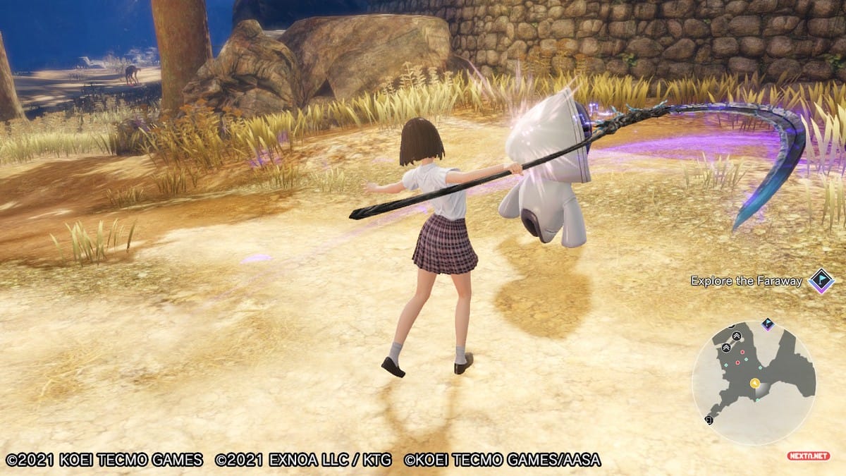 Continuando con lo comentado en el párrafo anterior, cuando exploras se nota la influencia de Atelier Ryza 2 en este proyecto. Y no lo decimos por decir, pasar por pasillos estrechos dando pasos laterales, gatear para atravesar obstáculos, escalar apoyándose en vegetación y compañía cogen por el camino animaciones prestadas, lo cual nos parece genial, porque si ya tienes hecha la animación, es más inteligente invertir los medios en ampliar el abanico de posibilidades. Por ejemplo, crearon movimientos para el cruce de puentes estrechos en los que la protagonista trata de mantener el equilibrio y en algunos escenarios se sortean abismos y lagos mediante cuerdas o barras metálicas, mientras que Ao solo cuenta con los músculos de sus brazos para pasar. Por otro lado, dado que el juego gira en gran medida en torno a los vínculos emocionales, esto se vio reflejado incluso aquí. Puesto que dichas acciones se salen un poco de los esquemas habituales, preferimos no hablar más de ellas por si alguien lo considera un spoiler.