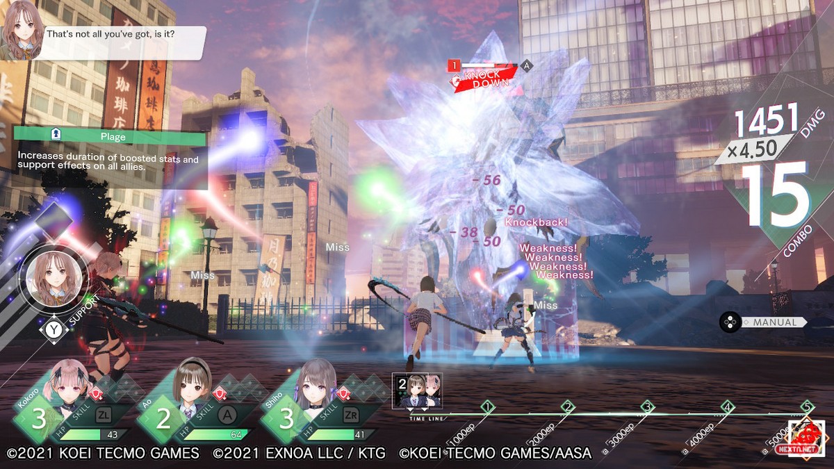En los RPG es habitual que hayan ataques que son más fuertes o débiles dependiendo de qué tipo de resistencias presuma el jugador y el adversario. Blue Reflection: Second Light no se baja de dicho carro y además de a los daños, también afecta a más elementos: cuando alguien recibe una ofensiva contra la que es débil pierde «EP», retrocede en la línea de tiempo y su velocidad de recuperación de «EP» disminuye, o lo que es lo mismo, es más fácil que se quede inmovilizado temporalmente. Sobra decir que hay habilidades que son útiles para reforzar o curar aliados y otras que se centran en debilitar al enemigo reduciendo sus «stats» o causándole problemas de estado. Asimismo, este lanzamiento eliminó la gestión de los antiguos «GP» de su predecesor e introdujo un sistema de niveles tradicional.