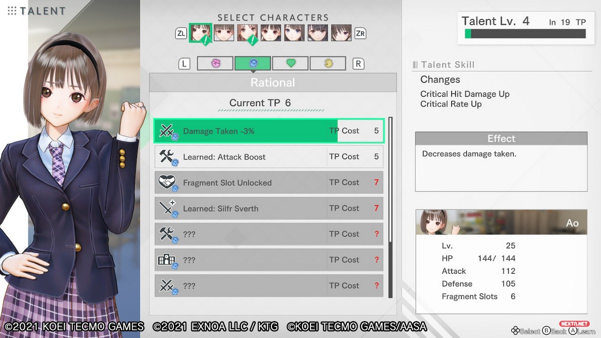 ¿Qué tiene que ver el apartado de simulación de citas con combatir? Pues que las citas están recompensadas con «TP» y «Fragments». Casi todas las protagonistas de esta aventura poseen una serie de «niveles de talento», los cuales mejoran mediante la acumulación de «TP» (Talent Points). Aparte de para subir de nivel de talento, la personalidad de cada chica pone a nuestra disposición 4 listas en las que canjear «TP». A cambio dan bonificaciones que otorgan desde más defensa, a aumentos en la velocidad de recuperación de «ether». Adicionalmente, cada chica cuenta con características únicas que brindar a su equipo, como puede ser un incremento de las posibilidades de que un enemigo deje caer un ítem. En cuanto a los «Fragments», en esta entrega facilitan la fórmula. En vez de ir montados en habilidades, ahora los personajes cuentan con una serie de huecos individuales en los que pueden equiparse «Fragments» para reforzarse de diversas maneras. Nota: los «Fragments» poseen varios tamaños, la cantidad de huecos se amplía hasta diez con la ayuda de los «TP» y otra manera de obtener estos puntos es completando misiones secundarias.