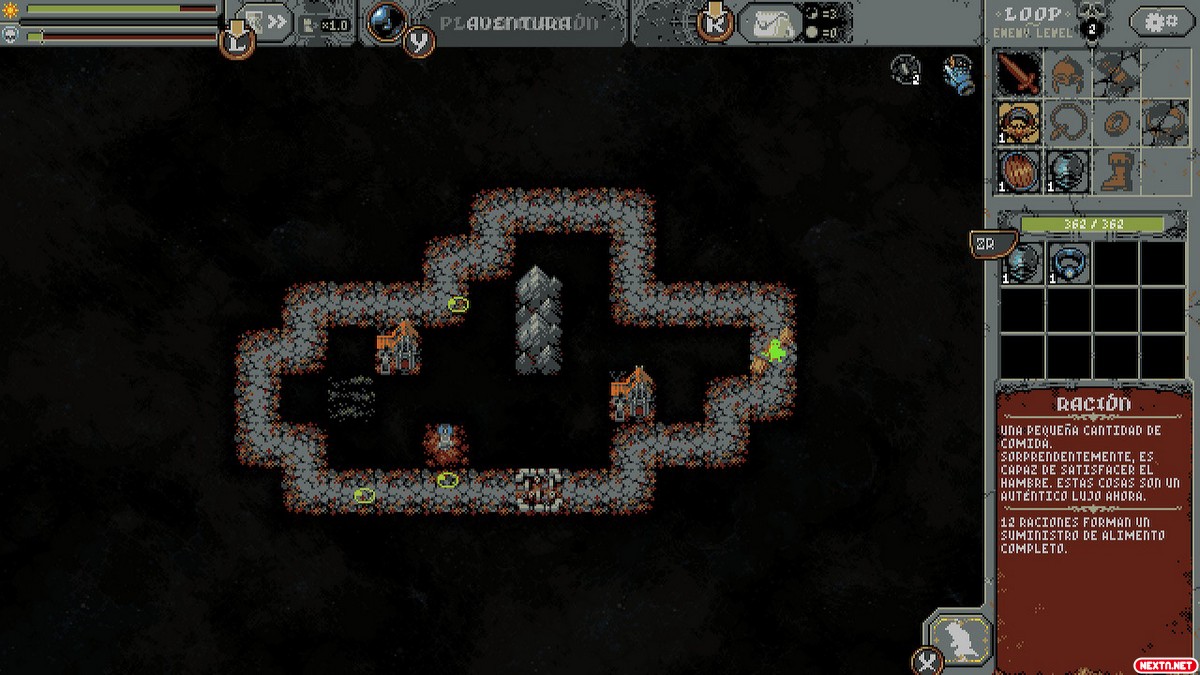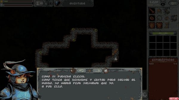 Así es como nos introducimos en la peculiar narrativa que plantea este título. La curiosidad por entender qué ha sucedido con el mundo del héroe está presente desde el primer instante, gracias al halo de misterio que cubre la narrativa. Nuestro avance por los bucles, y especialmente nuestros enfrentamientos con los jefes, son los que nos dan información valiosa al respecto. Poco a poco, vamos desentrañando los misterios… Y por el camino, reconstruimos el mundo. A grandes rasgos, Loop Hero consiste en eso: dar vueltas en un circuito y redibujar un mundo borrado. Pero esto es sólo la superficie.