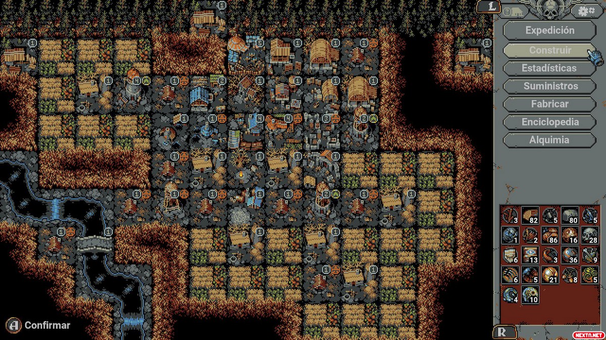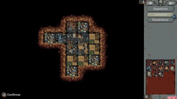 El campamento base tiene una simbiosis profunda con los bucles. Con la fogata como punto inicial, podemos ir añadiendo construcciones. A efectos prácticos, acabamos construyendo un pueblo. Una granja por allí, una cocina por allá, que si almacén, que si biblioteca… Los materiales que recolectamos sirven para construir estos equipamientos. A su vez, estos equipamientos nos otorgan bonificaciones en el bucle. Algunos nos desbloquean cartas de recuerdo, otros nos dan la posibilidad de llevar algunos suministros al viaje, es decir, objetos que nos otorgan ciertas bonificaciones. Y además, algunas de estas instalaciones también pueden mejorarse, y eso a su vez nos da más ventajas en el bucle.