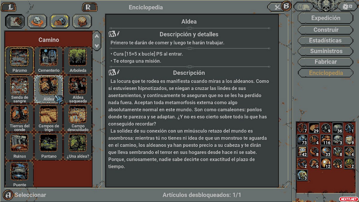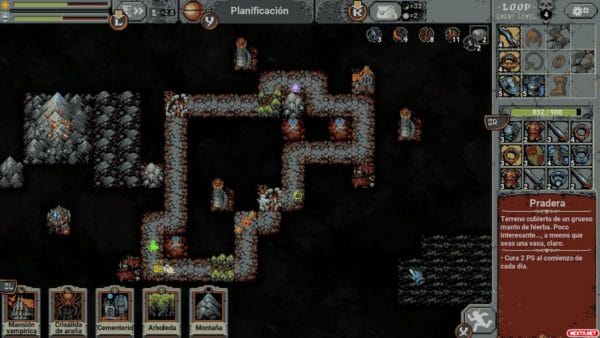 Al principio de la partida, contamos con poca variedad de cartas, pero ésta va aumentando con el avance. Hay mucha complejidad en el sistema de cartas de Loop Hero, y se nota el esfuerzo por diseñar una curva de aprendizaje adecuada. Y es que combinar cartas entre sí da resultados interesantísimos a veces. Por ejemplo, si se coloca una aldea junto a una mansión vampírica, pasa a ser una aldea destruida llena de necrófagos. Es decir, se convierte en un lugar muy peligroso, pero 3 bucles después se transforma en los Dominios del Conde, dándonos mejores misiones y más vida. El título nos va adentrando lenta y paulatinamente en esta complejidad, y hay muchísimo por aprender.