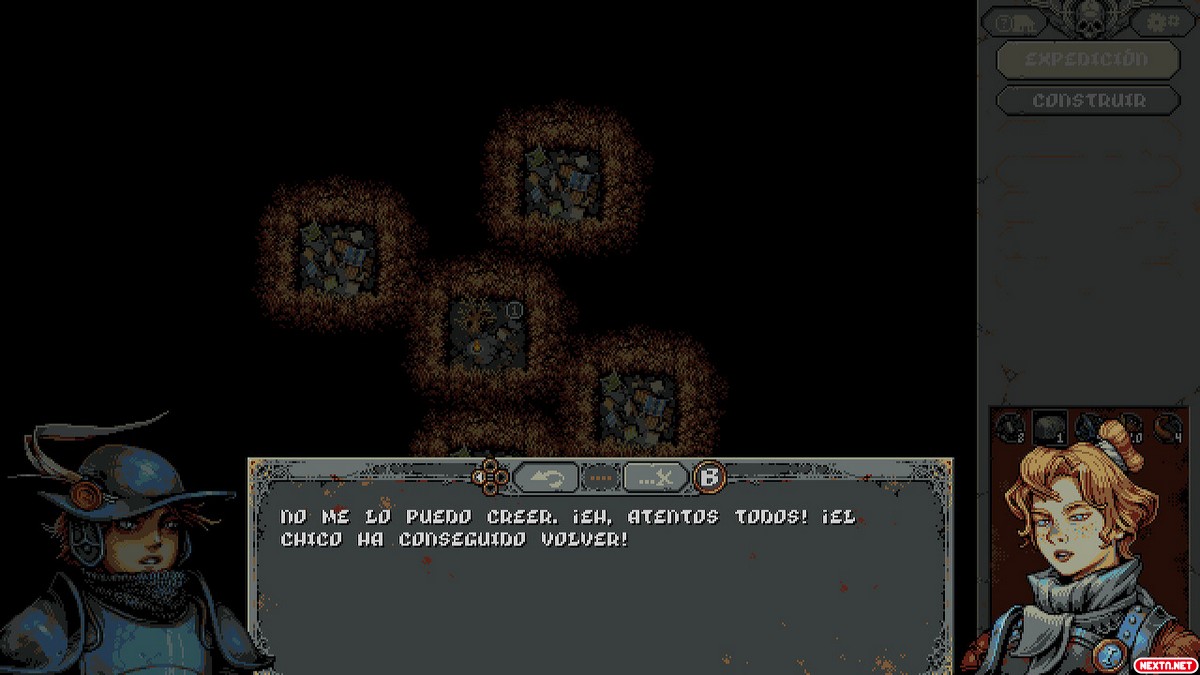 Sin embargo, aún nos queda descubrir a todos los enemigos, todas las cartas de mundo, los suministros, llenar el campamento base… La lista de logros está ahí para motivarnos. Pero en esta jugabilidad casi redonda hay una pega: en los compases finales, además de requerir mucho «farmeo», hace falta también un componente que escapa a nuestro control: el azar. Como los rasgos, recuerdos, etc. aparecen al azar, hay momentos en los que podemos sentir auténtica frustración al ver que el mundo progresa más rápido y con más eficacia que nosotros. Pero si nos armamos de paciencia, nos enfrentamos a un desafío duro pero justo que deja un fantástico sabor de boca al final.