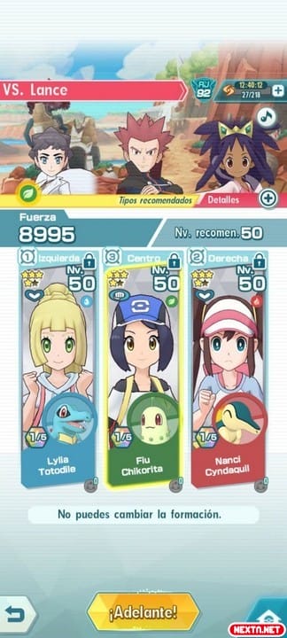 Notarás que tras este último movimiento la barra azul se ha llenado, así que es el momento de comenzar a sentenciar el combate. Utiliza Hoja Afilada, Ascuas y Pistola de agua y Hoja Afilada una vez más (en ese orden). Tras esto, los dos Pokémon en los laterales habrán caído y sólo te quedará el central. Y no sólo eso, pues la barra de «Movimiento Compi» ya estará llena. Es esa cosa de varios colores y tendrás que usarla con Chikorita para finalizar el combate. Ten en cuenta de que si Lance consigue ejecutar el movimiento compi antes que tú, es un K.O instantáneo para todo tu equipo.