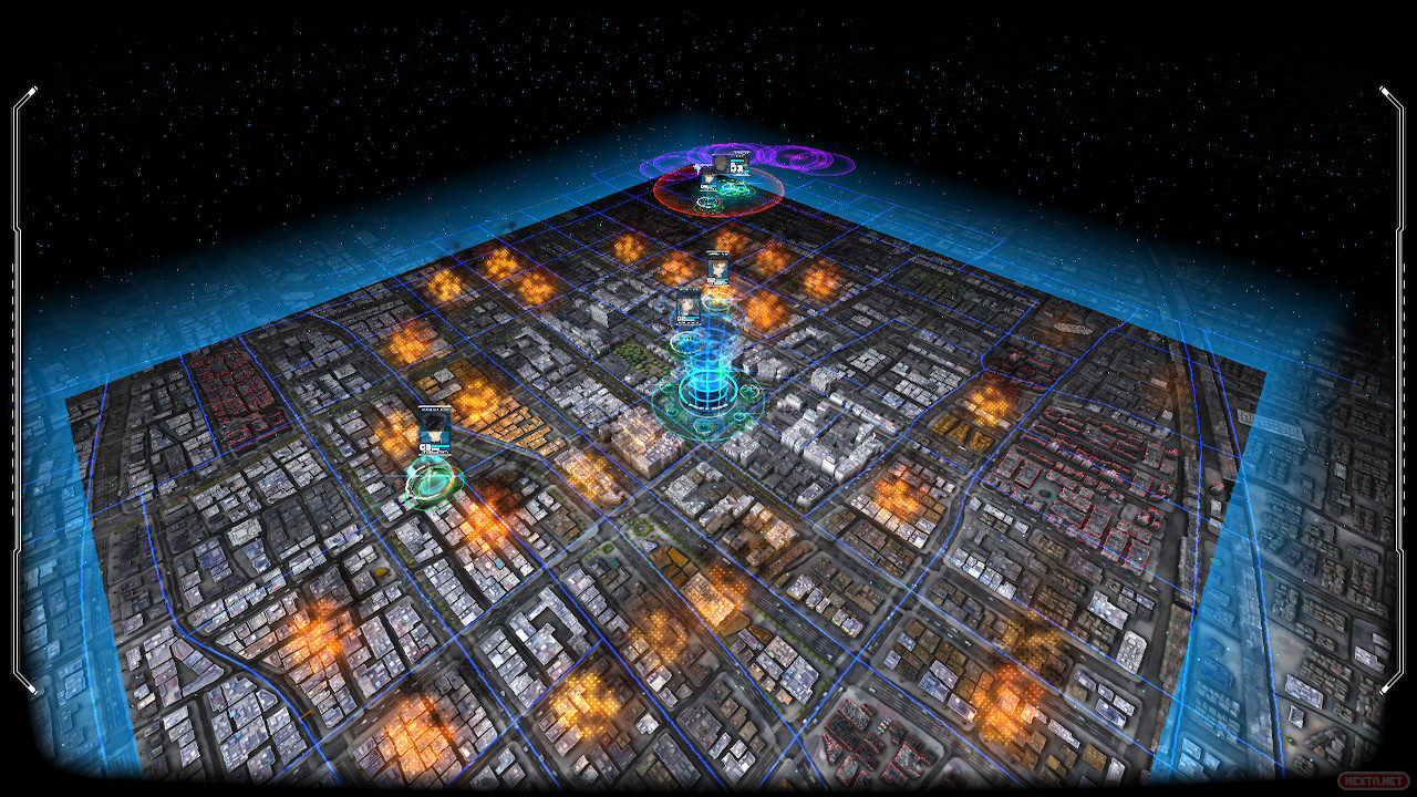 Por otra parte, tenemos un modo Batalla que inicialmente choca en lo visual directamente con lo que hemos estado jugando en el modo Aventura. Tenemos una ciudad que proteger con centinelas robóticos representados en el mapa por iconos y unos monstruos que parecen sacados de un «arcade de marcianitos» en 3D, y luego armas láser, luces neón, símbolos y explosiones por doquier, de estilo todo muy retro. Lejos de ser «agua y aceite», en realidad este estilo está perfectamente integrado, es algo que comprendes a medida que vas avanzando, e incluso tiene… No, mejor no seguir detallando, pues no podemos hablar más de esto sin hacer spoilers… Lo que sí nos gustaría recalcar es cómo las ilustraciones de los personajes, que representa cómo se comunican entre ellos desde dentro de las cápsulas de los centinelas, o por la ciudad, redondean este apartado.