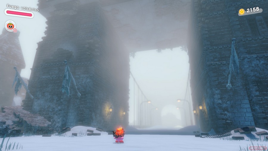 Así empieza la aventura del nuevo título de Kirby, y son muchos los ojos puestos en dicho título, ya que, como decía al inicio del análisis, Kirby y la tierra olvidada deja atrás los plataformas 2D, símbolo característico de la saga, para dar paso a un plataformas en 3D que no deja indiferente a nadie. Cuando vimos los primeros anuncios, muchos asemejaban a Kirby y la tierra olvidada con Super Mario Odyssey, ya sea por sus escenarios o por el estilo «libre» que tiene la última gran aventura del fontanero. Sin embargo, esto no es así, ya que Kirby y la tierra olvidada no deja de ser un plataformas en 3D pero con un camino acotado, es decir, no puedes ir libremente por el mapa como sí ocurría en Super Mario Odyssey. Esto se nota mucho en la cámara, ya que no podemos moverla a nuestro antojo, sino que se mueve sola según avanzamos.
