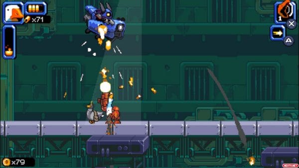 La mecánica de disparos y desplazamiento lateral en dos dimensiones adquiere un grado extra de complejidad a través de los distintos tipos de armas que podemos ir encontrando por el camino. De base, tenemos una pistola normal y corriente, con una potencia normal una cadencia de tiro no demasiado alta, pero por el camino recogemos metralletas, cañones y armas eléctricas de munición limitada. Nos ayudan a atravesar ciertos trechos complicados, y cuando agotamos su munición, volvemos a nuestra pistola estándar.