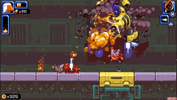 La jugabilidad de este título evoca a esas clásicas arcade de estilo run and gun y shoot’em up que consisten en avanzar, disparar, eliminar a los enemigos y seguir avanzando. Pero no se limita únicamente a eso, sino que introduce sus propias variantes, por ejemplo, la aparición de ayudantes que, además de luchar junto a nosotros, en ocasiones nos proporcionan algunas mejoras. Pero también las habilidades especiales de nuestro glorioso Mighty Goose: ralentizar el tiempo, lanzar bombas… o graznar, sin más. Podemos ir desbloqueando estas habilidades, además de algunas otras mejoras, a lo largo de nuestra partida.