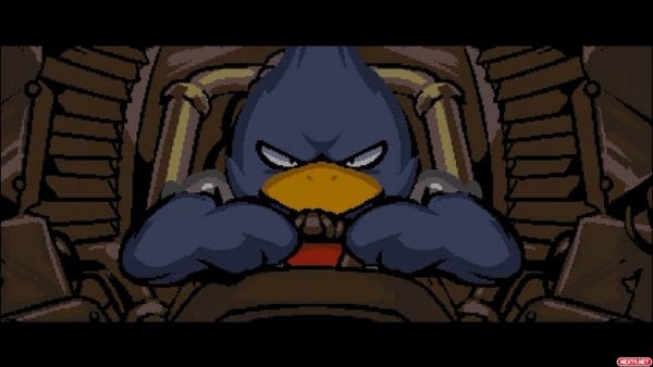Uno podría pensar que un título con unas raíces y unos propósitos tan «tradicionales» no deja espacio para la lírica. Nada más lejos. El estilo gráfico de Mighty Goose es un pixel art bastante sobrio, pero que sabe cuándo introducir la fantasía. Las breves cinemáticas presentan un arte que, aunque sea también pixelado, está muy trabajado y da un toque singular. Los momentos de más frenesí combativo provocan un ralentizamiento del tiempo que crea un efecto espectacular… Y de vez en cuando, nuestro amigo el ganso aparece en primera plana, como dándonos la enhorabuena por la que acabamos de liar. Un gustazo, vamos. Aunque hay que admitir que, a veces, la acción es tan frenética que ni te das cuenta de que te están matando.