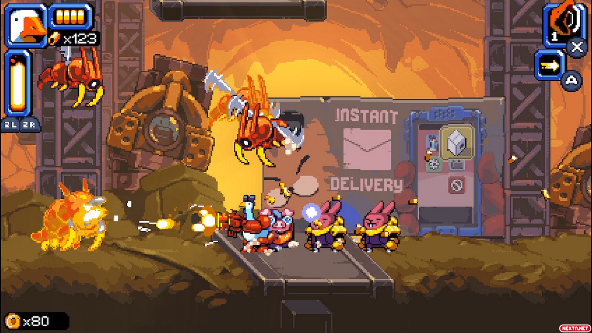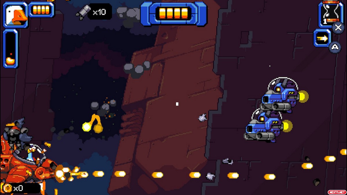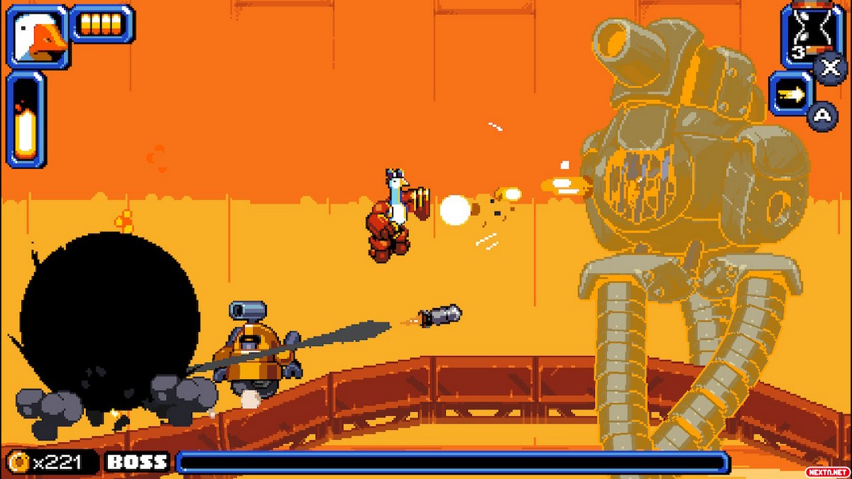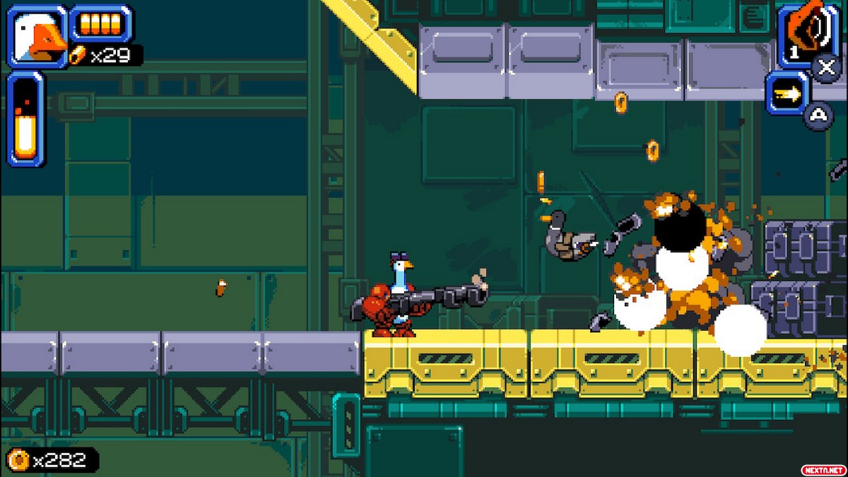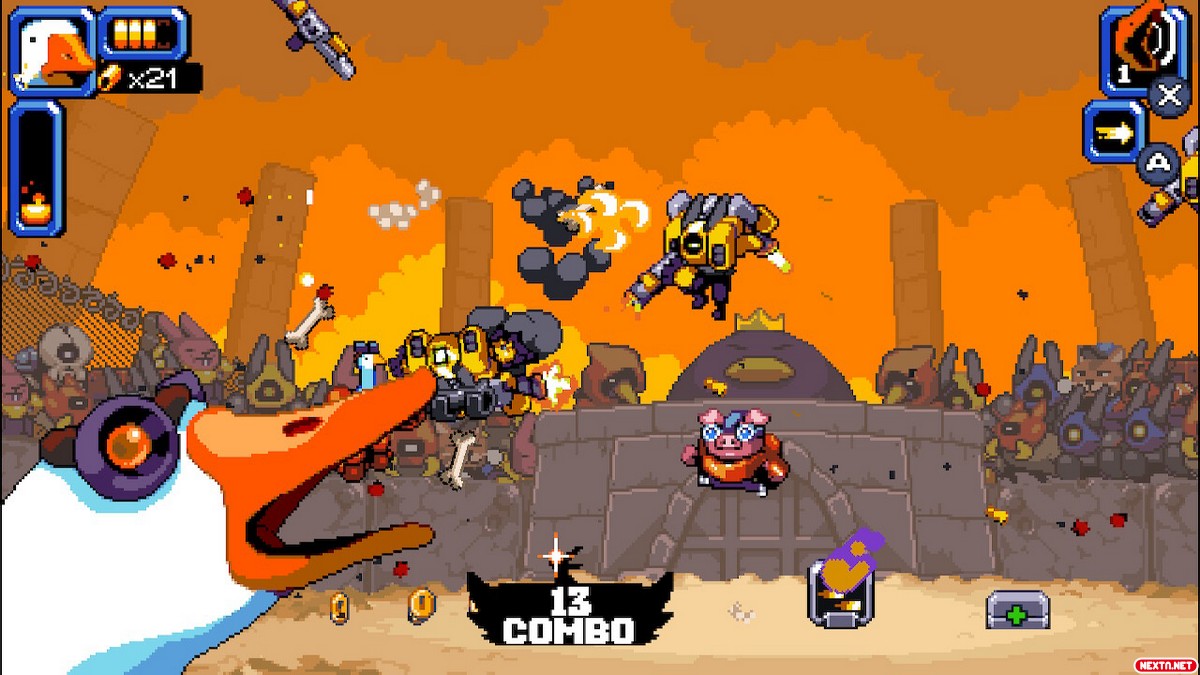 La jugabilidad de este título evoca a esas clásicas arcade de estilo run and gun y shoot’em up que consisten en avanzar, disparar, eliminar a los enemigos y seguir avanzando. Pero no se limita únicamente a eso, sino que introduce sus propias variantes, por ejemplo, la aparición de ayudantes que, además de luchar junto a nosotros, en ocasiones nos proporcionan algunas mejoras. Pero también las habilidades especiales de nuestro glorioso Mighty Goose: ralentizar el tiempo, lanzar bombas… o graznar, sin más. Podemos ir desbloqueando estas habilidades, además de algunas otras mejoras, a lo largo de nuestra partida.