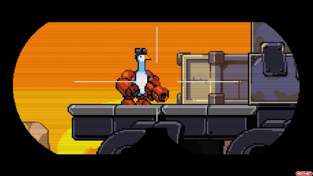 Uno podría pensar que un título con unas raíces y unos propósitos tan «tradicionales» no deja espacio para la lírica. Nada más lejos. El estilo gráfico de Mighty Goose es un pixel art bastante sobrio, pero que sabe cuándo introducir la fantasía. Las breves cinemáticas presentan un arte que, aunque sea también pixelado, está muy trabajado y da un toque singular. Los momentos de más frenesí combativo provocan un ralentizamiento del tiempo que crea un efecto espectacular… Y de vez en cuando, nuestro amigo el ganso aparece en primera plana, como dándonos la enhorabuena por la que acabamos de liar. Un gustazo, vamos. Aunque hay que admitir que, a veces, la acción es tan frenética que ni te das cuenta de que te están matando.
