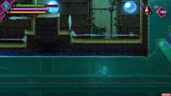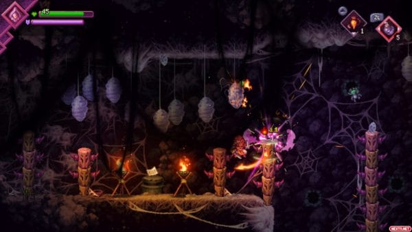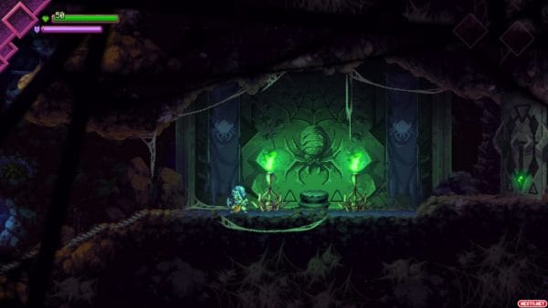 Por si no fuera suficiente con eso, el mundo de Terragaya es hostil a más no poder. El mapa, de estilo metroidvania, está repleto de trampas ocultas, suelos de pinchos, zonas con veneno, con fuego o electrificadas… No se puede avanzar de forma descuidada prácticamente en ningún momento, ya que hay amenazas en cada rincón. Tampoco falta alguna fase de contrarreloj en la que tenemos que ser lo más rápidos posible para que la muerte no nos alcance. Como ya decía antes, lo de morir unas 300 veces no es ni mucho menos una exageración. Hay que armarse de paciencia para adentrarse en Souldiers, y eso puede hacer que algunos jugadores se lo piensen dos veces. Pero si uno se lo propone, merece la pena.