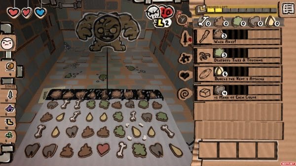 En cuanto a la parte de puzles y construcción de mazos, es algo más complejo de explicar. ¡Pero es bastante sencillo de entender una vez has jugado un par de partidas! En cada habitación encontramos una serie de enemigos que hay que derrotar para avanzar a la siguiente y así hasta el jefe del nivel. Hasta ahí esta claro. Pero en vez de hacernos paso a base de llorar, Bum-Bo ataca a base de hacer puzles al más puro estilo Puzzle Quest o Candy Crush. Cada vez que combinemos cuatro o más pieza de los distintos colores (blanco, gris, amarillo, verde y marrón) Bum-Bo puede realizar una acción en función del color de las piezas. Evidentemente, a más piezas combinadas a la vez, mejor será el efecto. Estas acciones consisten en atacar a varios enemigos, atacar a un único enemigo pero haciendo mucha pupa, conseguir más movimientos para nuestro turno, paralizar enemigos tirándoles mocos y poner cacas para defendernos. Sí, McMillen no puede dejar ni un momento de ser un creador tan peculiar.