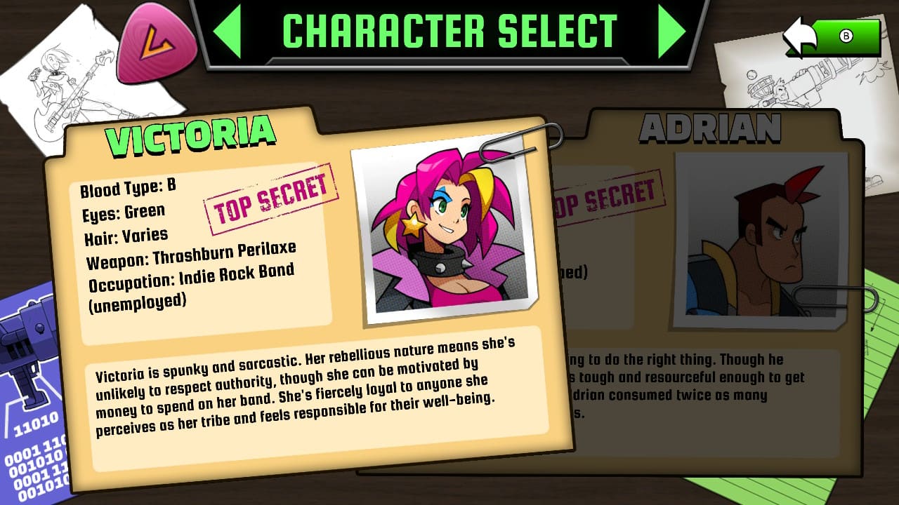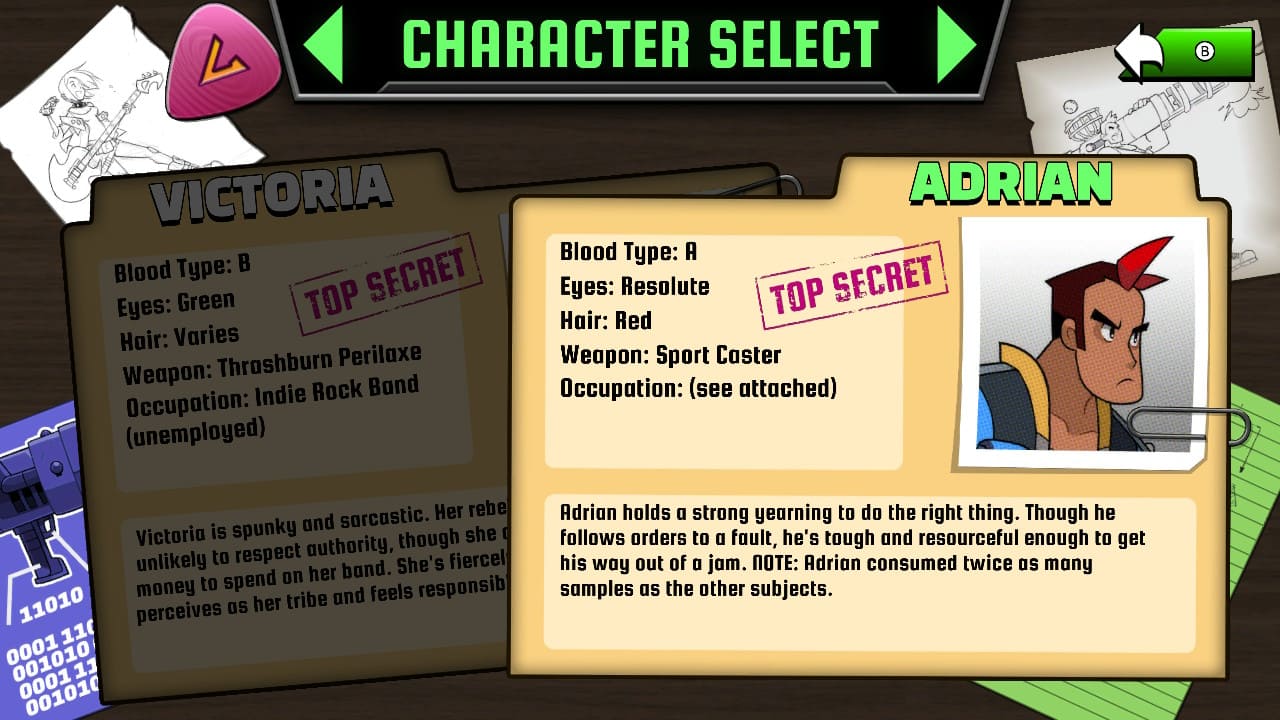 Spidersaurs de comienzo permitiéndonos escoger entre sus dos personajes. Mientras la rockera/punk Victoria destroza a los enemigos disparando con su guitarra, el aspirante a policía y pizzero profesional Adrián utiliza su equipo deportivo para derrotar monstruos. A primera vista podría parecer, a tenor de sus movimientos, que se trata de personajes clónicos. Nada más lejos de la realidad. Ambos cuentan, más allá de la posibilidad de disparar en 8 direcciones, con diferentes armas y evoluciones de las mismas que van apareciendo en pantalla y que tenemos que disparar para poder capturar. Os suena, ¿verdad? Y esto es algo que invita a probar ambos personajes.