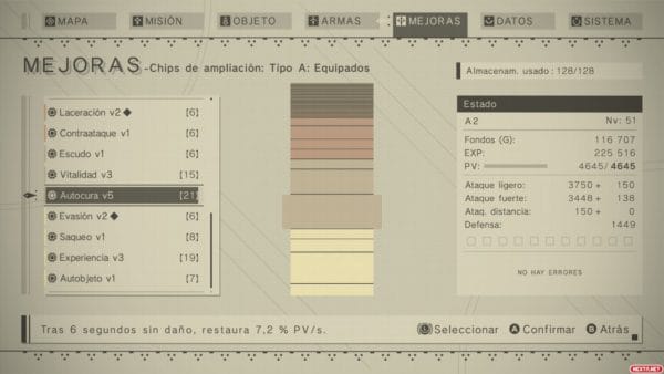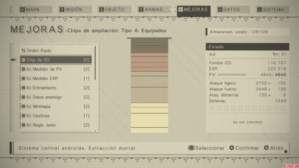 Y aquí me gustaría hacer dos pequeñas aclaraciones en cuanto a los chips, porque me parece una mecánica brillante que destaca frente a otros sistemas de combate de Platinum. Los chips pueden cambiar radicalmente la forma en la que afrontamos los combates y por eso tenemos la opción de tener tres sets y mejorarlos a base de fusionarlos para que mejoren sus efectos u ocupen menos espacio en la memoria donde los equipamos. Y precisamente por ser tan importantes, se pierden al morir, quedándonos sin ellos, a no ser que lleguemos al cadáver y los recuperemos. Una mecánica que a más de uno le sonará de otros juegos, pero que aquí sube las apuestas y en vez de perder el equivalente al dinero o experiencia, perdemos directamente el equipo y con él toda la personalización que nos permitía afrontar los combates especializándonos en luchar de una forma u otra. Para compensar, también podemos encontrarnos con los cuerpos de otros jugadores y decidir si nos quedamos con su equipamiento o se lo devolvemos. La parte negativa de todo este sistema es que realmente no hace falta profundizar en todo el tema de los chips para jugar únicamente la historia del juego de forma casual, siempre que no te quieras meter en los múltiples desafíos que lo exigen. Basta con dejar que el juego optimice los mejores chips por nosotros y listo.