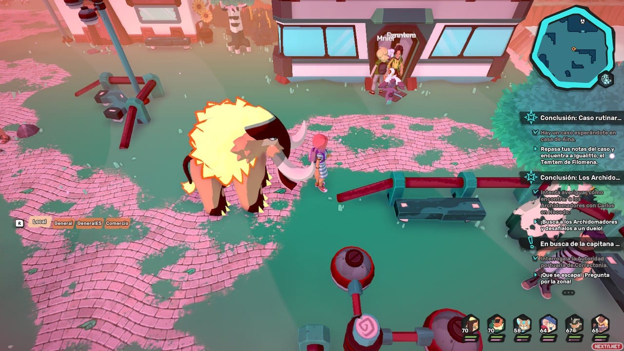Pasamos ahora un poco a hablar de la historia. El comienzo es similar a otros tantos juegos: es la Víspera del Aprendiz y tú (después de haber personalizado a tu personaje y haber elegido tus pronombres, muy importante) te embarcas en una aventura para ser domador de Temtem, con la guía del profesor Konstantinos y Max, le rival de toda la vida al que no conoces pero que desde el primer momento ya le tienes manía por ser un engreíde envidiose. Al principio la historia es más relajada, hasta que te cruzas con el Clan Belsoto (recordad, los Belsoto comen caca), una organización criminal que crea el caos por todas partes. A partir de aquí, toda la historia se centra en esta batalla contra el Clan Belsoto. No hay leyendas ocultas ni Tems legendarios (bueno, sí hay alguno, pero no pintan nada), e incluso derrotar a los maestros del dojo sirve más como pretexto para obtener su ayuda o conocer mejor la situación que como objetivo a alcanzar. Quizá lo que podría haber dado más de sí es el final, ya que consiste simplemente en “este es el malo y quiere conquistar todo, a por él”, aunque a veces un buen personaje malvado puede ser el que simplemente es malo y punto. Eso sí: se trata del combate más complicado y enrevesado de todo el juego.