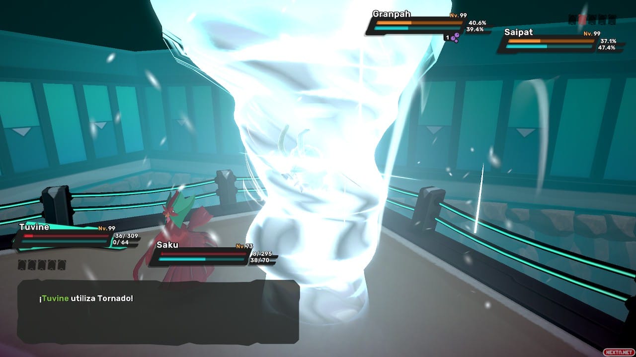 Todo esto está muy bien, pero no es lo único que aporta esa dificultad extra. Por una vez, los personajes piensan. La IA de este juego está bien lograda, haciendo que los NPC contra los que luchamos aprovechen las debilidades de nuestros Tems para superarnos. De hecho, la sorpresa te la llevas cuando no lo hacen (en más de una ocasión me he dicho “¿por qué no me ha hecho un ataque eléctrico si podía ganarme?”). Y cuando llegas a los maestros del dojo (el equivalente a los líderes de gimnasio), el desafío es mayor, empezando con que todos ellos utilizan un equipo completo de 6 Tems, incluso la primera. Tienes que prepararte bien para el combate, o lo pasas mal.