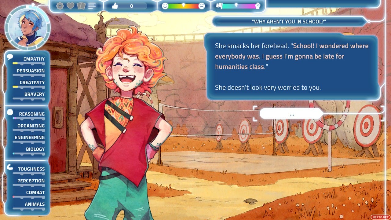 A partir de los primeros meses, empieza la parte de “gestión”. Como personita joven, debes hacer lo posible para crecer, aprender y colaborar con la colonia en la medida de lo posible. El tiempo transcurre mediante un sistema de meses, y cada mes lo podemos dedicar a una actividad con la que mejorar nuestros atributos (divididos en emocionales, inteligencia o fuerza). Es elección totalmente nuestra decidir cómo aprovechar el tiempo… o si aprovecharlo siquiera. Como hemos mencionado antes, nuestras decisiones forjan nuestra vida, de modo que ciertos atributos nos ayudan para realizar acciones especiales, o bien podemos mejorar nuestra afinidad con nuestres amigues, o bien podemos oponernos a la autoridad y ser unes rebeldes.