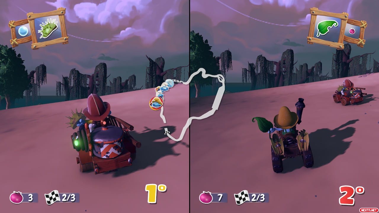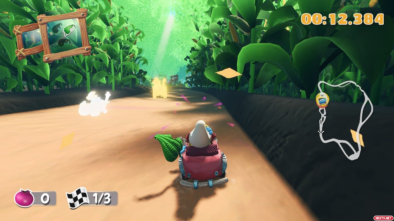Las carreras se dividen en tres copas, cada una de ellas con cuatro circuitos únicos en los que encontraremos atajos para adelantarnos sin que nadie se lo espere, frutas para potenciar nuestras habilidades y objetos que lanzar a nuestros rivales para entorpecer sus sueños de hacerse con el primer lugar. También es posible completar todos estos circuitos en una copa al estilo «modo espejo», siendo una buena opción para cuando te canses de enfrentarte a la IA y optes por enfrentarte a ti mismo. En favor de la IA, he de decir que esta puede llegar a ser bastante agresiva y hay jugarte más de una mala pasada si pecas de confiado, pudiendo convertirla en incluso más agresiva en las carreras personalizadas.