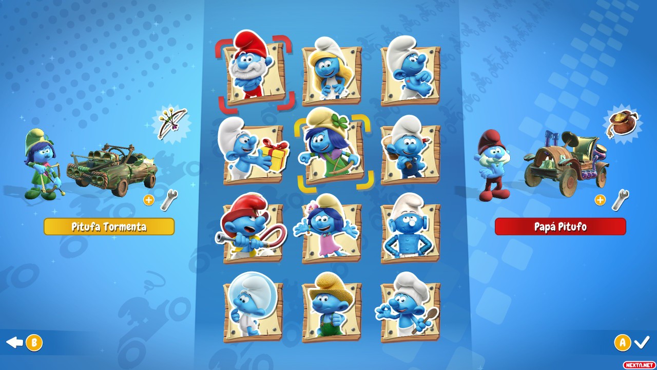 Aunque de buenas a primeras pueda parecer que SMURFS KART es una copia de Mario Kart, lo cierto es que el juego se esfuerza para, dentro de lo que cabe en un género que suele ser bastante clónico, tener personalidad propia, brindándonos la posibilidad de jugar con un total de 12 Pitufos entre en los que encontramos una mezcla de los clásicos como Papá Pitufo o Pitufina y otros que parecen un tanto más «modernos» (no sé exactamente si se han creado para este juego o provienen de otros títulos de la marca) en carreras multijugador o en solitario.