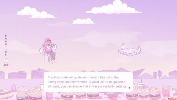 Aun así, el juego contiene varias opciones de accesibilidad para ayudar a los jugadores a que no se atasquen, como ampliar el margen de tiempo para pulsar bien una nota, que haya un metrónomo sonando de fondo o que directamente se indique en la pantalla qué acción realizar y cuándo. Estas ayudas también están disponibles a la hora de afrontar cada nivel en modo difícil e incluso al intentar ir a por la puntuación perfecta, donde el objetivo es no fallar ningún ritmo.